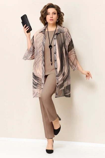 Костюм женский: блуза, брюки, топ. Легкая удлиненная блуза из шифона с застежкой на пуговицы. Рукав блузы чуть спущенный, втачной, книзу с разрезом, длина рукава 48см.Длина блузы по центру спинки-101 см Брюки из текстиля, прямые с высокой посадкой, с притачным поясом на резинке. Длина брюк по боковому шву- 100см. Топ со спущенным коротким рукавом. Длина топа по центру спинки-58см. Украшение в виде подвески- в комплекте изделия. Топ, брюки: полиэстер 53%, вискоза 44%, спандекс 3%. Блуза: