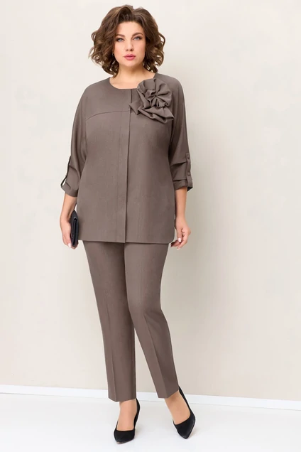 Костюм женский: жакет, брюки. Жакет прямого силуэта на потайной застежке, с округлой горловиной и со съемным украшением, прямые классические брюки - универсальный комплект для различных вариантов носки. Длина жакета по центру спинки-73см. Элегантный рукав 3/4, с патой на цельнокроеной основе. Брюки прямые с высокой посадкой, с притачным поясом на резинке. Длина брюк по боковому шву- 100см.