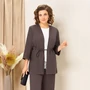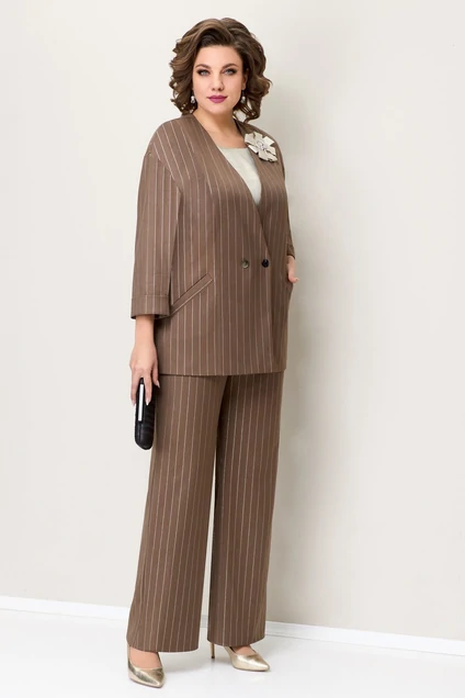 Костюм женский: жакет, брюки, блуза. Стильный двубортный жакет из текстиля прямого силуэта с карманами и V-образной горловиной. Полочки жакета на подкладке. По бокам жакета- неглубокте разрезы. Длина по центру спинки- 72см. Рукав спущенный с подворотом по низу, длина рукава- 50см. Брюки прямые с высокой посадкой, с притачным поясом со вставками с резинкой. Длина брюк по боковому шву- 102см. Блуза из легкого текстиля со спущенным рукавом. Длина блузы по центру спинки- 59см. Съемное украшение-брошь в комплекте изделия.