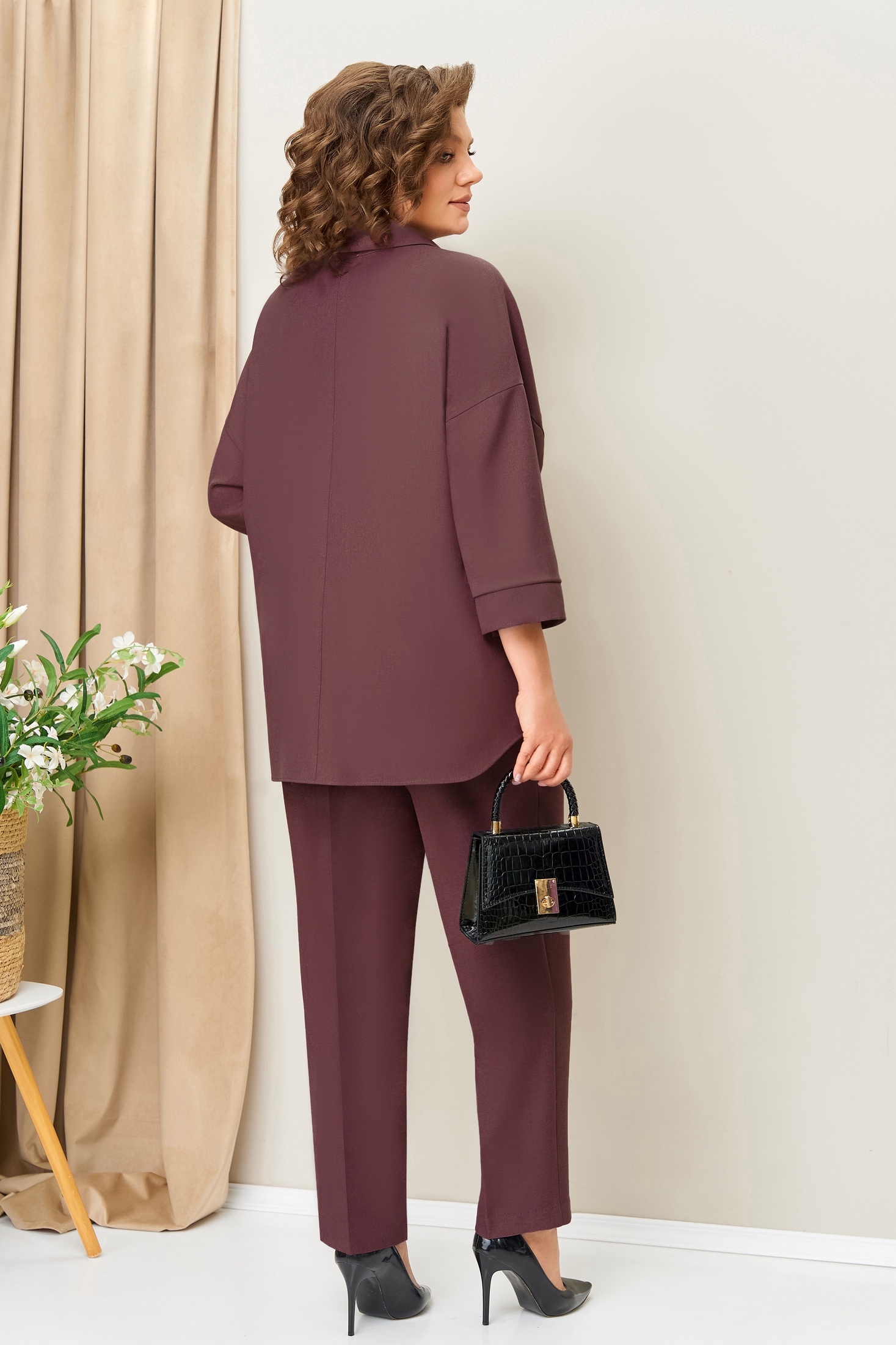 Костюм брючный 1406 слива VOLNA – это универсальный комплект, который станет прекрасным выбором для различных образов. Коллекция бренда VOLNA предлагает тройку из текстиля средней плотности, состоящую из жакета-рубашки с цельнокроеным рукавом и застежкой на пуговицы, прямых брюк с высокой посадкой и легкой блузы с рисунком. Материал костюма включает полиэстер, вискозу и спандекс, что обеспечивает комфорт и долговечность. Жакет имеет длину по центру спинки 72 см, а брюки – длину по боковому шву 101 см. Блуза завершается спущенным коротким рукавом и длиной по спинке 63 см. Костюм в стильном сливовом цвете отлично подходит для осеннего и весеннего сезона, делая каждый день особенным.
