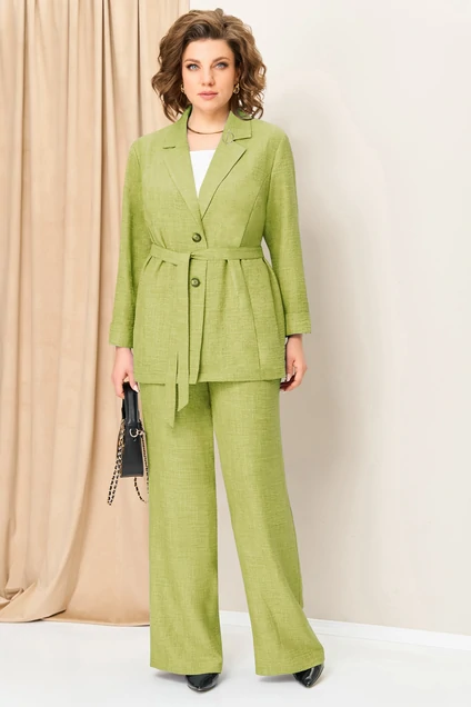 Костюм женский: жакет, брюки, блуза. Элегантный комплект- тройка из легкого текстиля. Жакет без подкладки с застежкой на пуговицы, с разрезами по бокам и съемным поясом. Длина жакета по центру спинки- 71см. Рукав жакета втачной, с отворотом. Длина рукава- 56см. Брюки прямые с высокой посадкой, с притачным поясом на резинке. Длина брюк по боковому шву- 100 см. Хлопковая блуза без рукавов с полукруглым низом и складками на плече. Длина блузы по спинке- 65 см. Изысканная брошь в комплекте изделия.