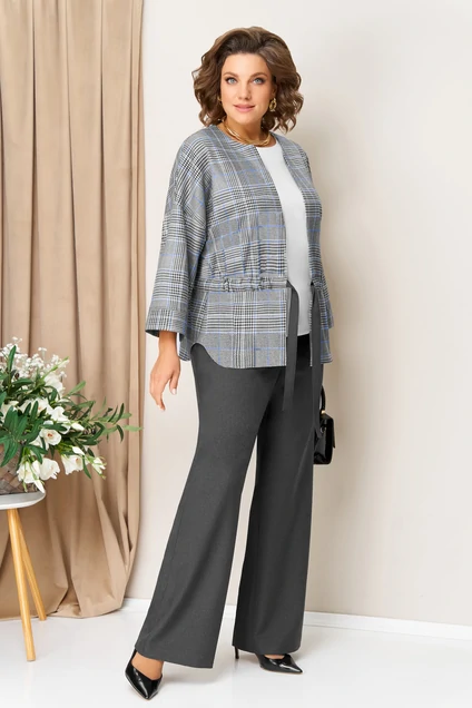 Эффектная тройка: жакет из текстиля с кулиской без подкладки, прямые свободные брюки и легкая блуза. Рукав жакета втачной, спущенный 3/4. Длина рукава 52см.Длина жакета по центру спинки- 65 см. Брюки из текстиля, прямые с высокой посадкой, с притачным поясом на резинке. Длина брюк по боковому шву- 106 см. Блуза со спущенным коротким рукавом. Длина блузы по центру спинки- 59 см.