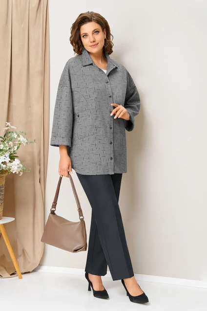 Универсальный комплект- тройка . Жакет-рубашка из утепленного текстиля на трикотажной основе, с цельнокроеным рукавом и застежкой на пуговицы.Длина жакета по центру спинки- 72см. Брюки прямые с высокой посадкой, с притачным поясом на резинке. Длина брюк по боковому шву- 101 см. Блуза со спущенным коротким рукавом . Длина блузы по спинке- 63 см.