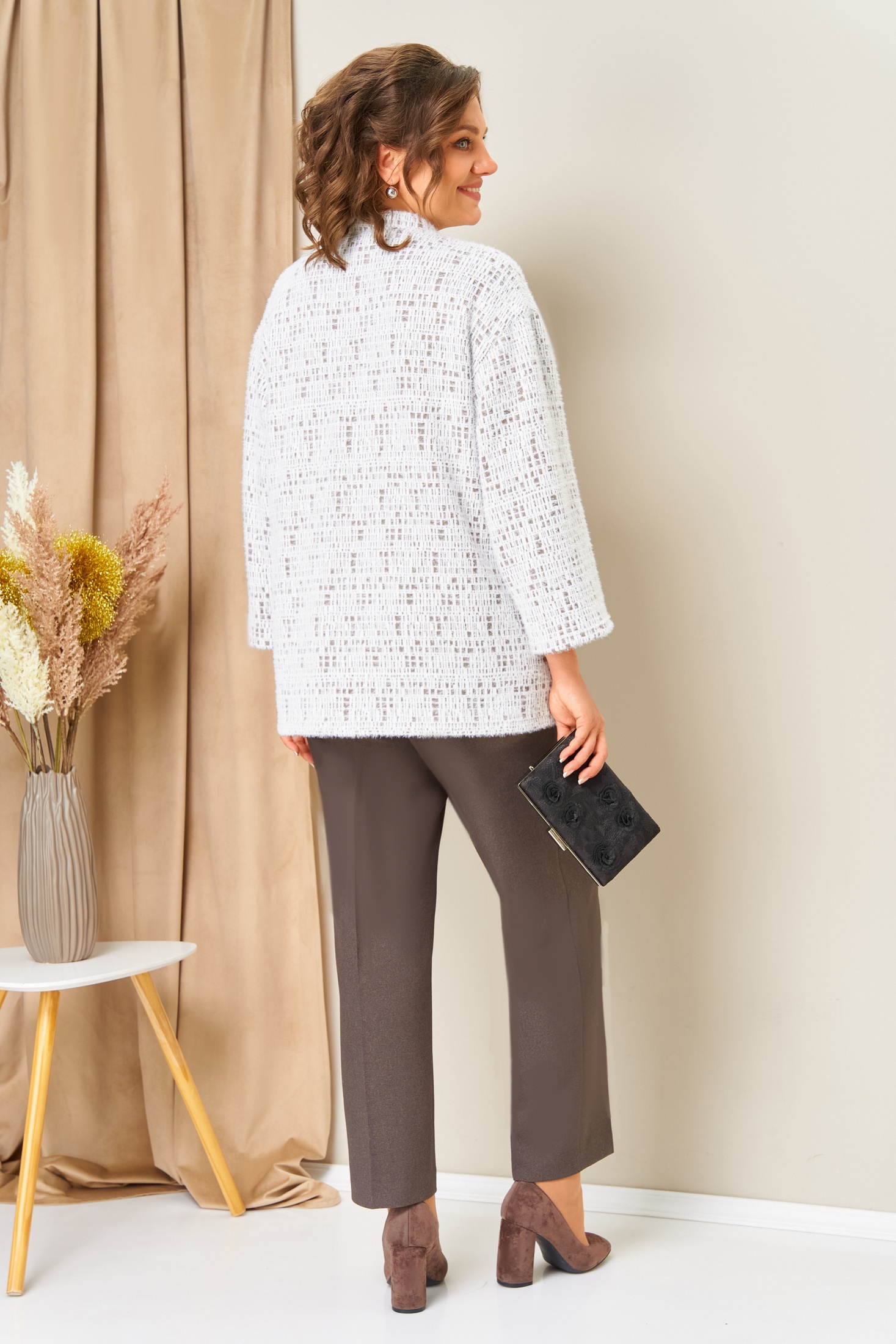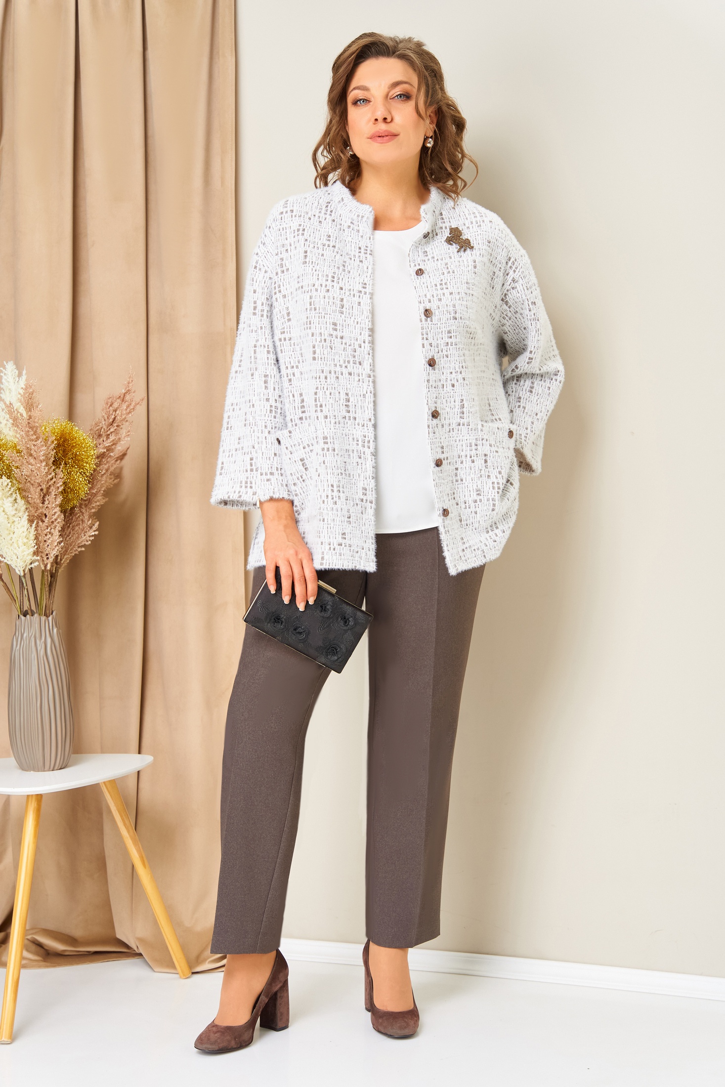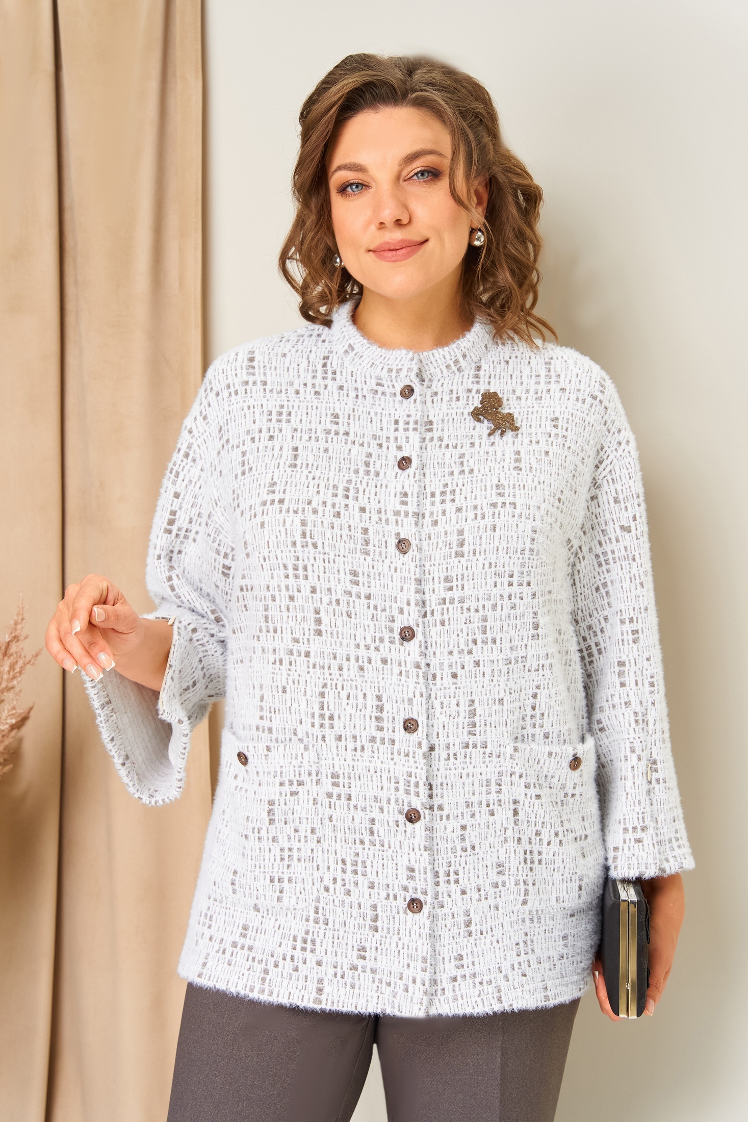 Костюм брючный 1439 бежевый VOLNA — идеальный выбор для стильных и уверенных в себе женщин. Коллекция бренда VOLNA предлагает комфортный комплект, состоящий из жакета и брюк. Жакет выполнен из трикотажа с составом 74% вискоза, 15% ангора и 11% полиэстер. Он имеет длину по центру спинки 71 см, втачной слегка спущенный рукав длиной 52 см и потайные молнии в рукавах. Брюки с высокой посадкой изготовлены из 66% полиэстера, 33% вискозы и 1% эластана, имеют притачной пояс на резинке и длину по боковому шву 100 см. Блуза из легкого текстиля дополняет образ. Этот костюм идеально подходит для весенне-осеннего сезона, его бежевый цвет подчеркивает утонченность и сдержанность. Отличный выбор для офиса или деловых встреч благодаря удобству и универсальности. Длина блузы по центру спинки- 62см.