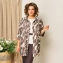 Жакет с застежкой на пуговицы, с пришивной кулисой и поясом, прямые классические брюки и блуза- универсальный комплект для различных вариантов носки. Длина жакета по центру спинки- 71см. Элегантный рукав с отложной манжетой на цельнокроеной основе. Брюки прямые с высокой посадкой, с притачным поясом на резинке. Длина брюк по боковому шву- 102см. Блуза из легкого текстиля с принтом, со спущенным коротким рукавом. Длина блузы по центру спинки- 62см.