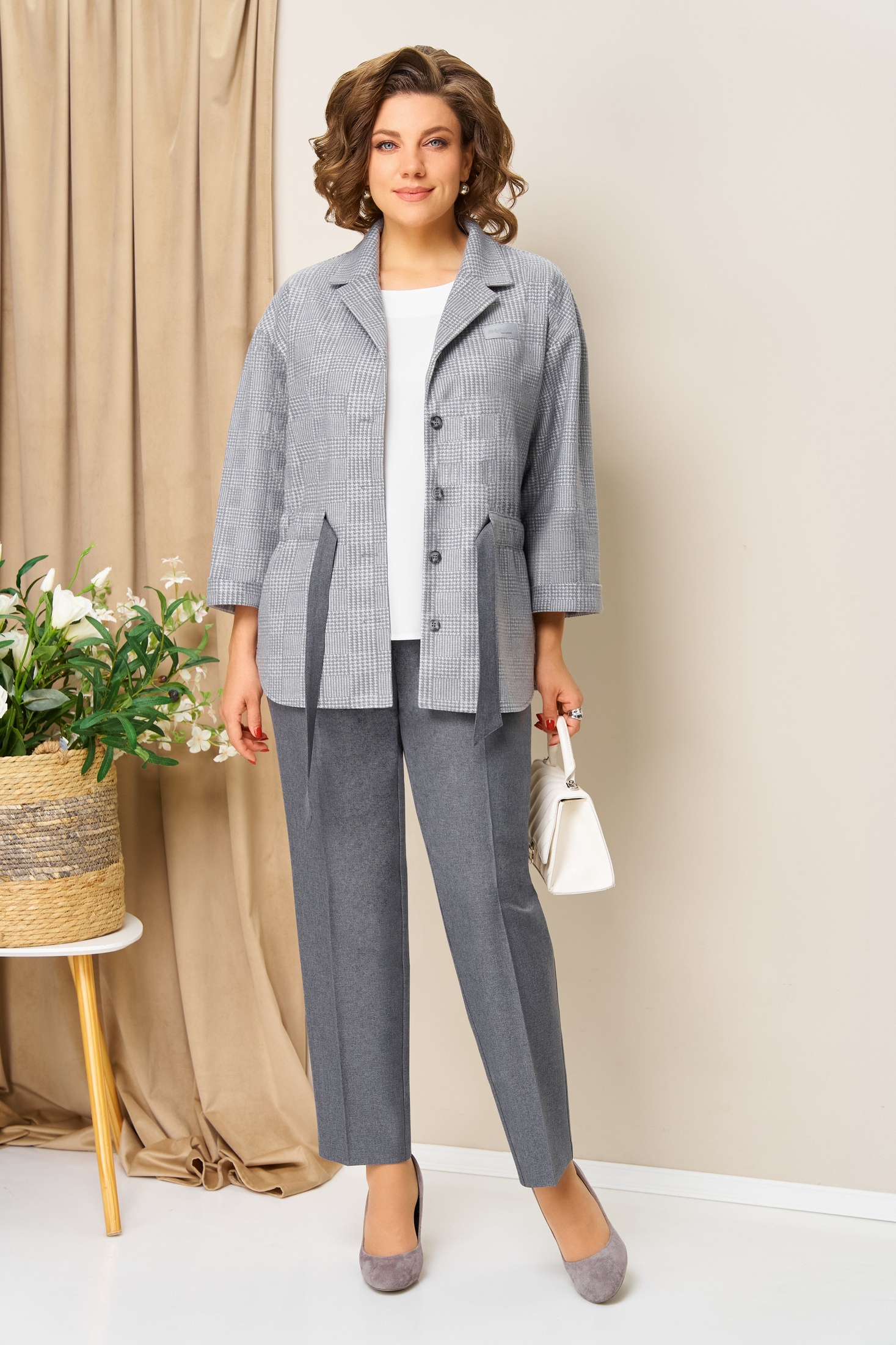 Костюм женский: жакет, брюки, блуза. Жакет с застежкой на пуговицы, с пришивной кулисой и поясом, прямые классические брюки и блуза- универсальный комплект для различных вариантов носки. Длина жакета по центру спинки- 71см. Элегантный рукав с отложной манжетой на цельнокроеной основе. Брюки прямые с высокой посадкой, с притачным поясом на резинке. Длина брюк по боковому шву- 102см. Блуза из легкого текстиля с принтом, со спущенным коротким рукавом. Длина блузы по центру спинки- 62см. Блуза: полиэстер 95%, эластан 5%.