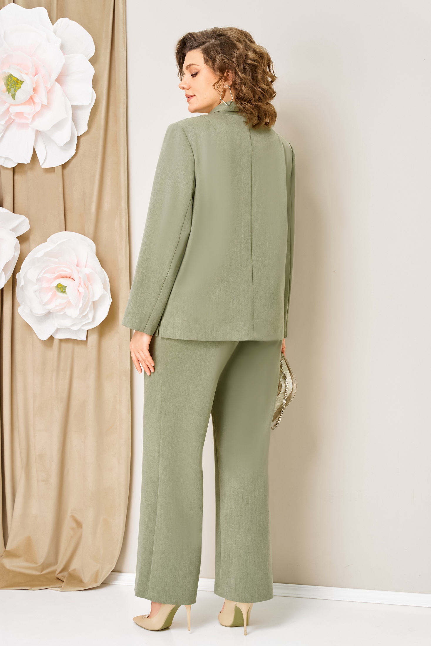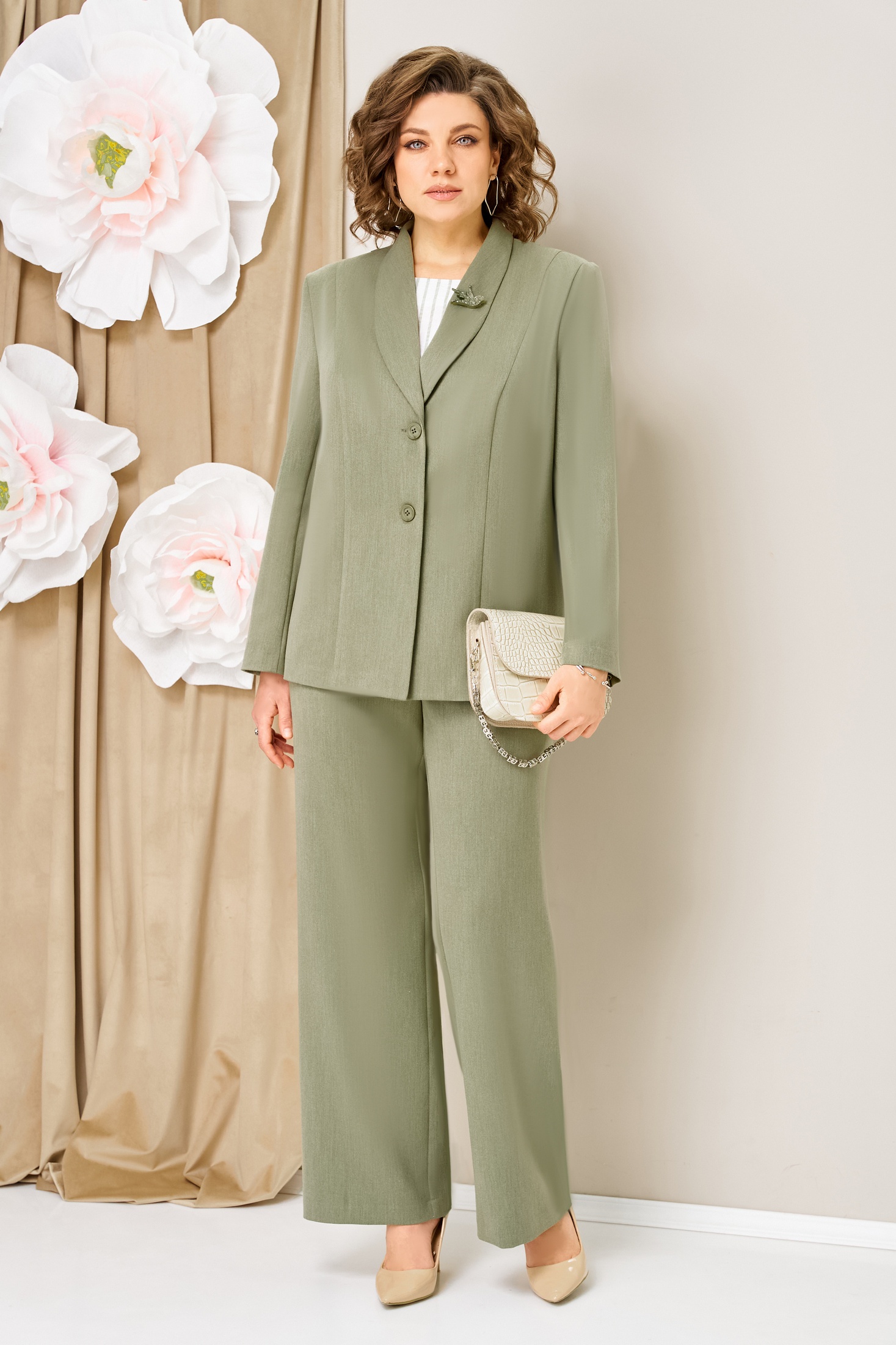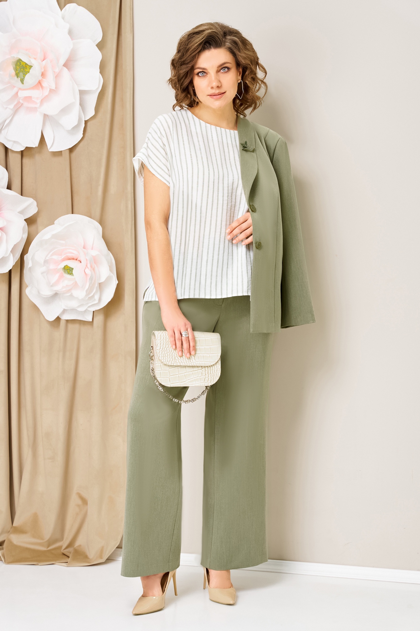 Костюм брючный 1462 олива VOLNA — это стильная тройка, которая включает в себя жакет, брюки и блузу с рисунком. Коллекция бренда VOLNA предлагает элегантный офисный стиль с комфортом. Жакет длиной 65 см имеет воротник шаль и застежку на пуговицы, с небольшими разрезами по бокам для дополнительной свободы движения. Брюки с высокой посадкой и длиной 102 см по боковому шву обеспечивают идеальную посадку благодаря притачному поясу с резинкой. Блуза добавляет нотку изысканности рисунком в тон основной ткани. Материал сочетает в себе полиэстер, вискозу и спандекс, обеспечивая комфорт и долговечность. Оливковый цвет костюма подходит для деловой среды и повседневного использования в любое время года. Длина рукава- 63 см. Длина блузы по центру спинки- 60см.
