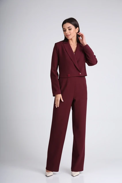Костюм женский, состоящий из жакета и брюк. Жакет на подкладке, укороченный, двубортный. Застегивается на пуговицу. На полочке расположен нагрудный карман «листочка». Рукав втачной, двухшовный. Длина рукава для роста 164 см 60 см, для роста 170 см 62 см. Длина изделия от плеча по спинке для роста 164 см 45 см, для роста 170 см 47 см. Брюки с завышенной линией талии со шлевками, расклешенные от бедра. По боковым швам расположены карманы. Застежка «молния» в боковом шве. Длина брюк от линии талии для роста 164 см 107 см, для роста 170 см 110 см.