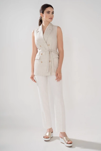 Костюм женский двухпредметный из костюмной ткани, состоит из жилета прямого силуэта со съемным завязывающимся поясом и прямых брюк с лампасом. Костюм предназначен для повседневной носки в летний период.
