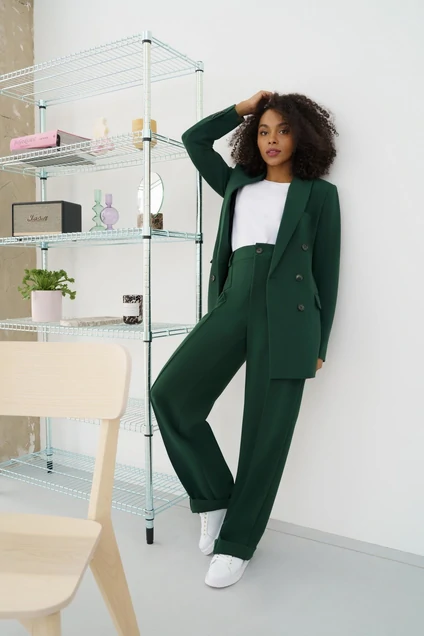 Темно-зеленый костюм - это универсальный выбор для деловых встреч и повседневных мероприятий. Такой костюм не только подчеркнет ваш деловой стиль, но и добавит в него элегантности и шика. Костюм женский двухпредметный из костюмно-плательной ткани, состоит из прямых брюк и удлиненного жакета оверсайз.