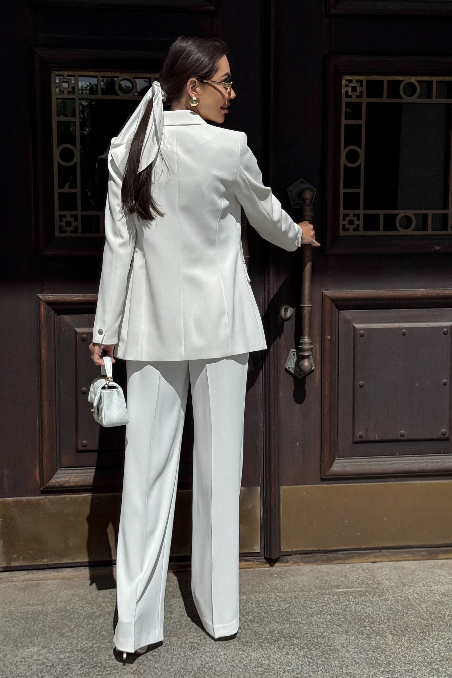 Элегантный женский костюм-тройка в белом цвете — идеальный выбор для тех, кто ценит изысканный стиль, качество и универсальность. Комплект состоит из приталенного жакета, лёгкой блузы с сатиновым блеском, прямых брюк со стрелками и акцентного пояса с роскошной вышивкой. Костюм женский, 3-х предметный, нарядный, состоит из жакета, брюк, и блузки. В комплект к брюкам идет съемный пояс с декоративной вышивкой.