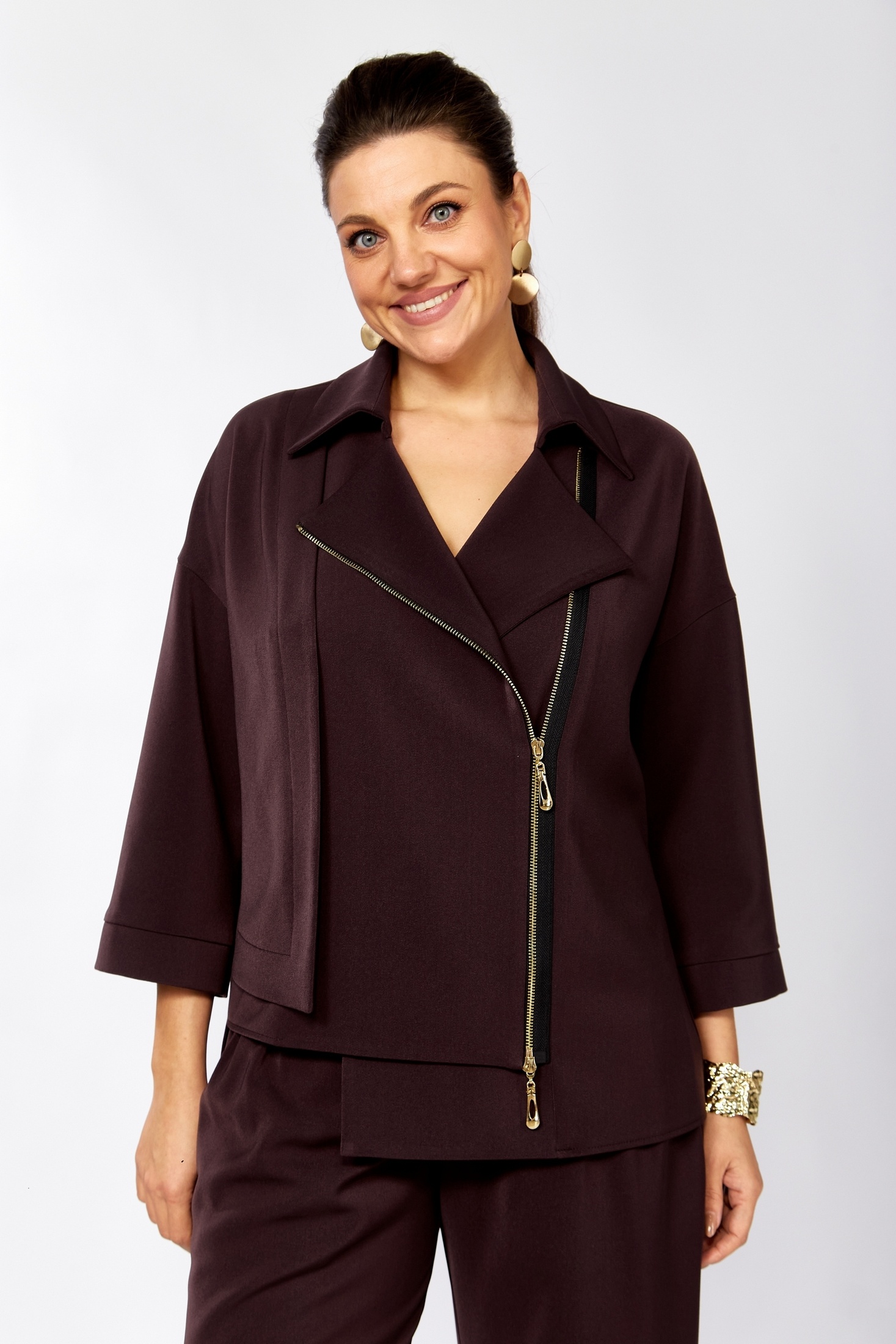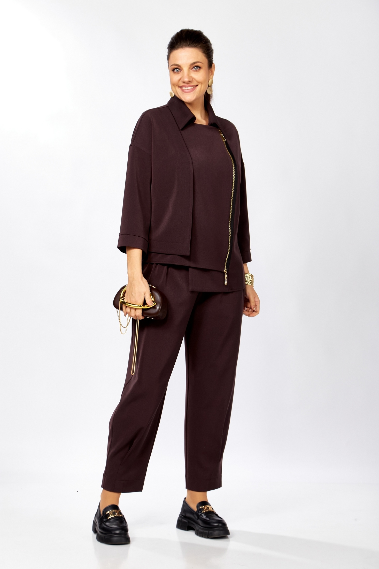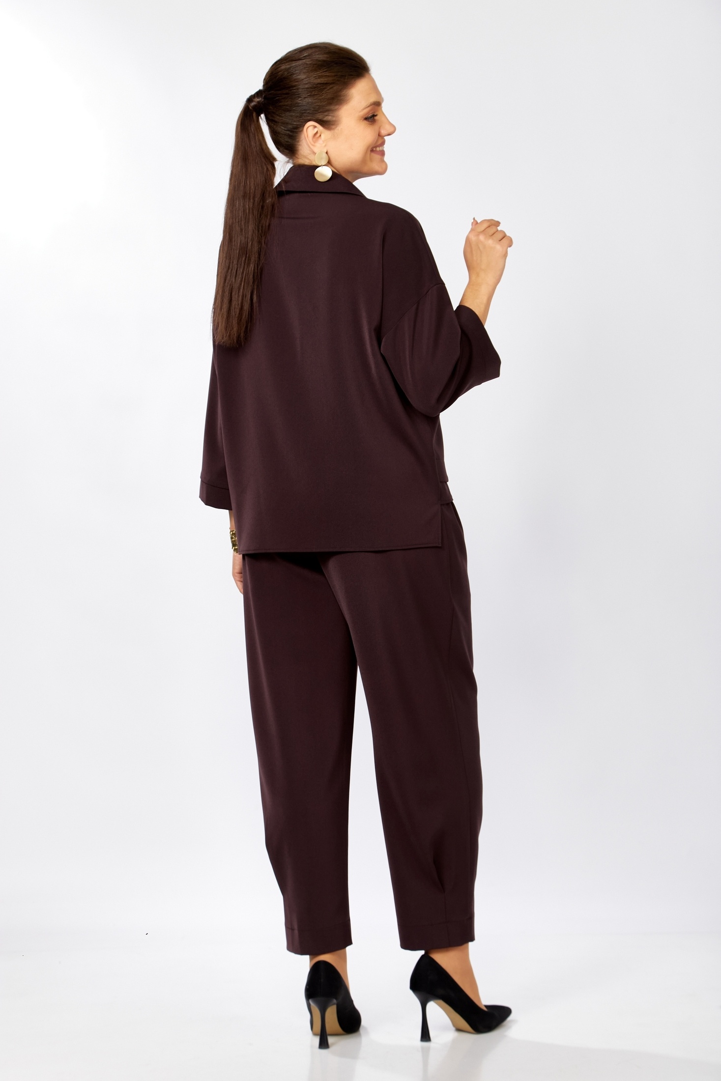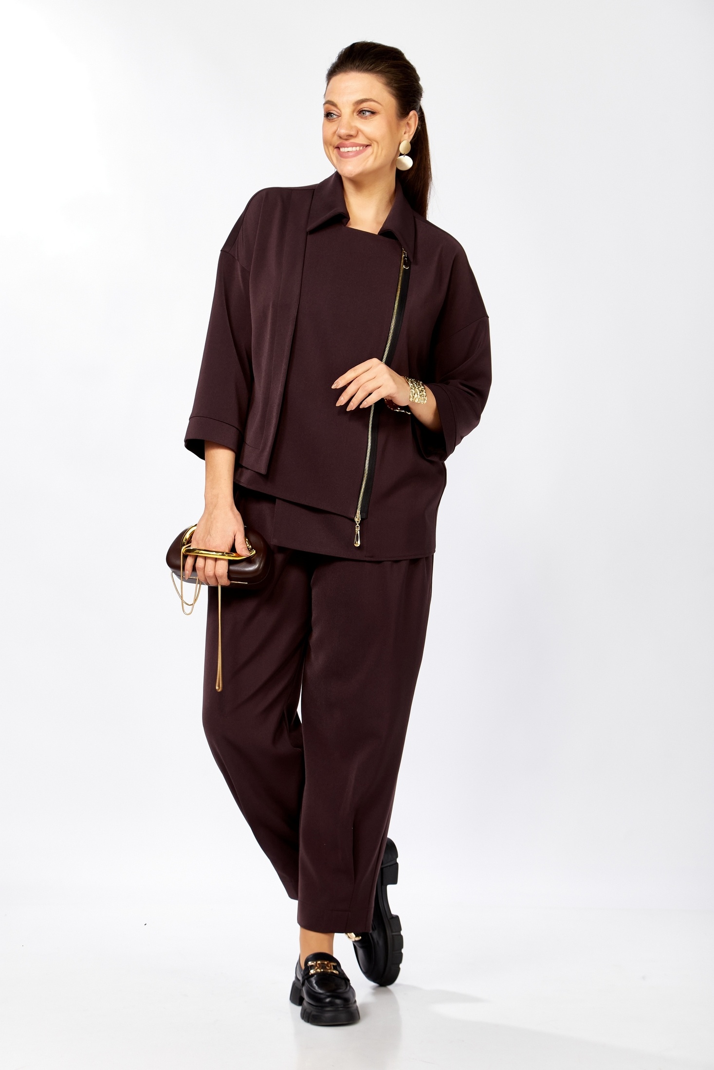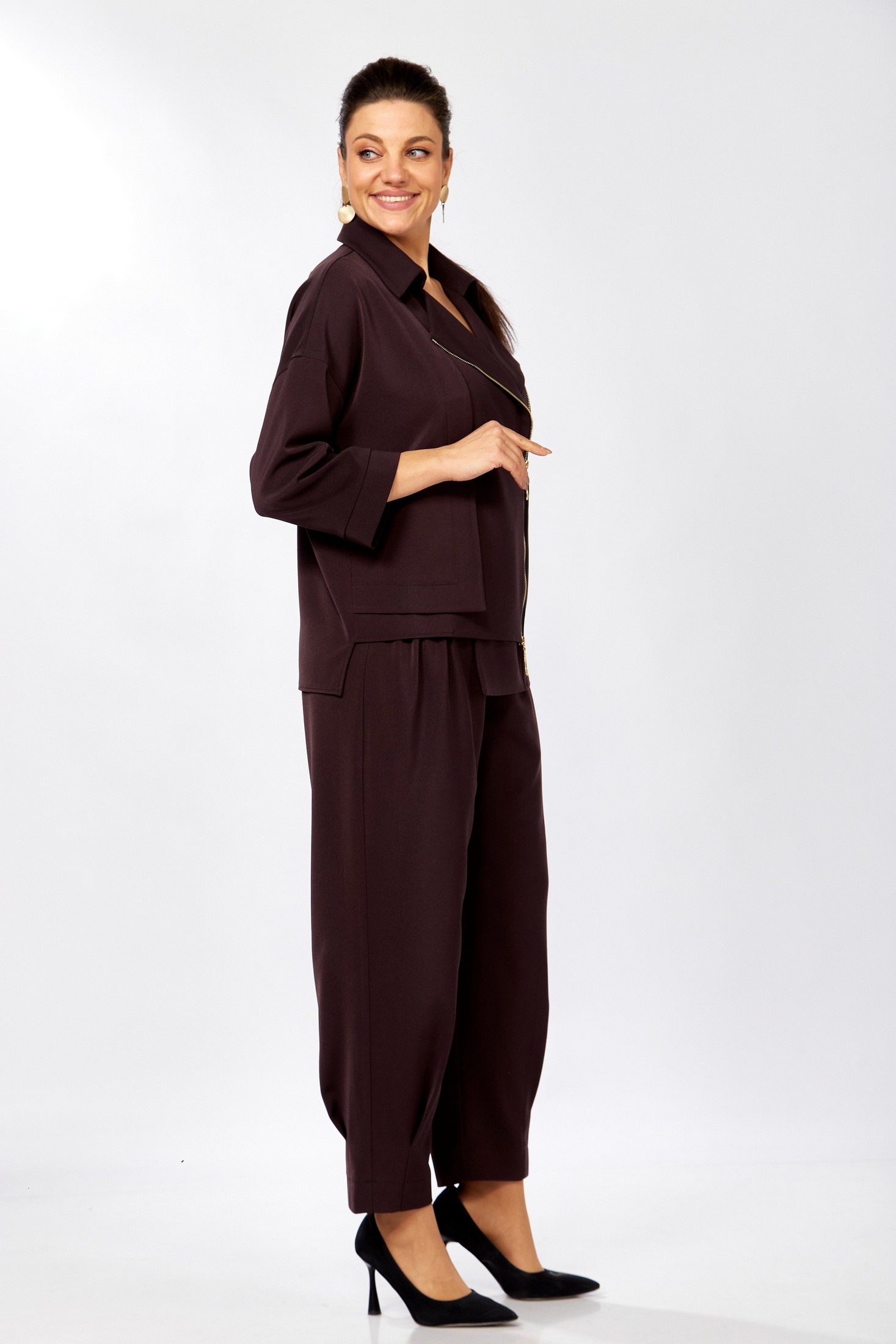 Современный костюм из поливискозной плотной ткани насыщенного сливового оттенка, сочетающий комфорт и элегантность. Жакет свободного прямого кроя с воротником с отрезной стойкой и архитектурными линиями, со спущенной линией плеча, создающими структурный силуэт. Застежка- молния золотого цвета. Рукава длиной ¾, что позволяет украсить запястья в тон молнии. Брюки прямые, широкие, слегка зауженные к низу, с дополнительными складками на поясе, придают комплекту динамичность и легкую дерзость. На передних половинках брюк обработаны карманы с листочкой по линии притачивания со сборкой. Длина брюк 95см, длина рукава 36,5см. Декор может отличаться от представленного на фото.