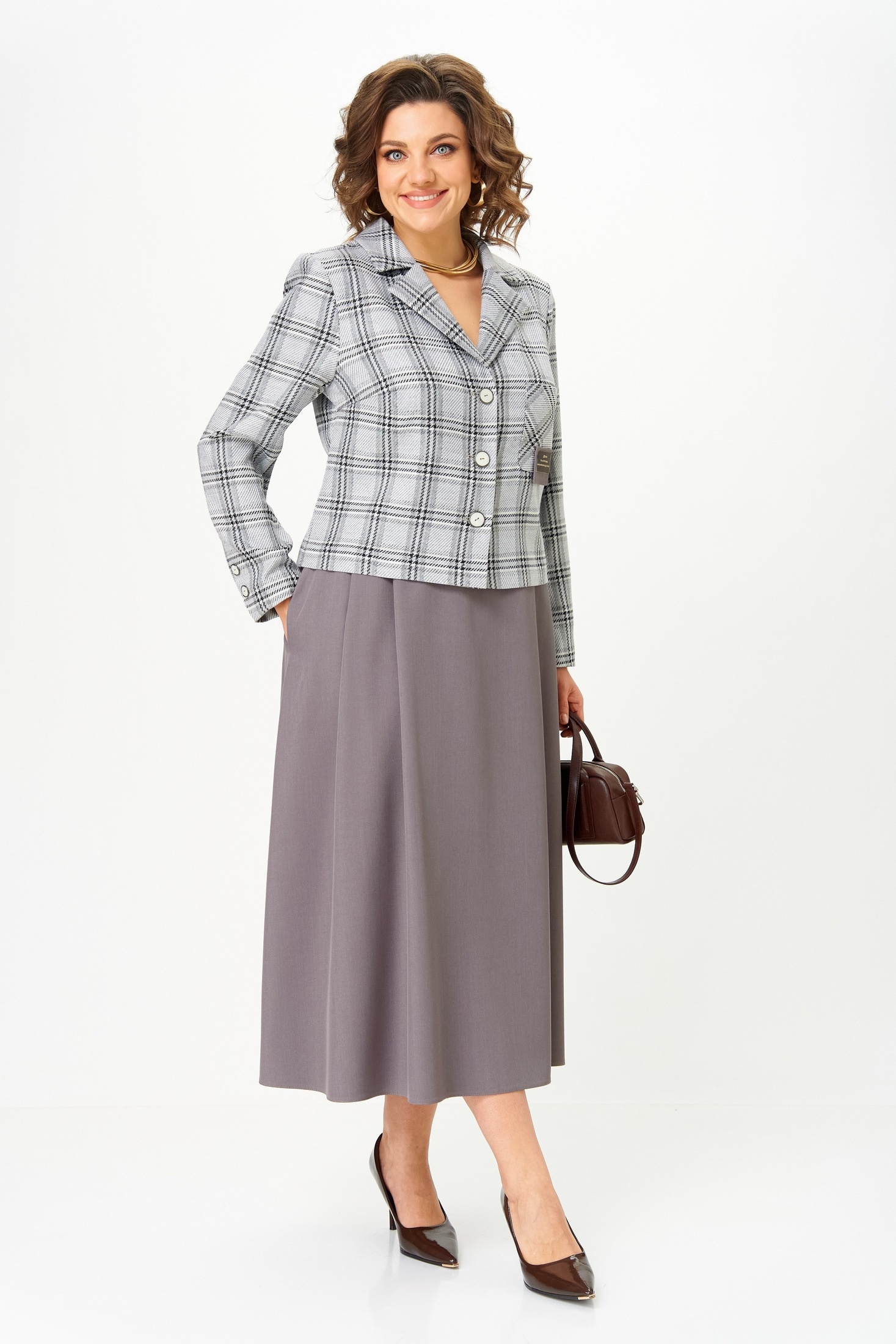 Костюм с юбкой 24-17А серый AIRA style сочетает в себе изысканную элегантность и современный классический стиль. Коллекция бренда AIRA style выполнена из ткани с высоким содержанием полиэстера и вискозы, что обеспечивает комфорт и долговечность. Жакет с пиджачным воротником и застежкой на пуговицы, украшен декоративной нашивкой на кармане. Юбка А-силуэта имеет складки и карманы в боковых швах, а также эластичную резинку для идеальной посадки. Серый цвет и клетчатый узор придают образу сдержанную утонченность. Комплект идеально подходит для деловых встреч и ежедневных офисных задач в осенний или весенний сезон.