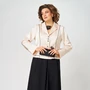 Образ излучает элегантность и утончённость, сочетая мягкую классику с лёгким акцентом на современность. Кремовый жакет подчёркивает свет лица и создаёт впечатление мягкого сияния, а тонкий контрастный кант формирует графичность и стройнит силуэт. Мягко приталенный крой и декоративные пуговицы придают наряду изысканный. Костюм полуприлегающего силуэта с фигурными рельефами от плеча проходят по переду, а контрастный тёмный кант по рельефам, борту, карманам и низу визуально стройнят. Рукав втачной двушовный с манжетой пот низу. Манжета декорирована пуговицами и кантом. Юбка с центральными складками и разрезом добавляет женственность.