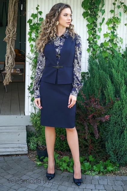 Юбка зауженная к низу, на притачном поясе, застегивающемся на одну обметанную петлю и пуговицу. Застежка в среднем шве заднего полотнища на потайную тесьму-молнию. Боковые швы смещены на перед фигурной формой. Заднее полотнище с талиевыми вытачками и средним швом, заканчивающимся шлицей. Юбка на подкладке..
