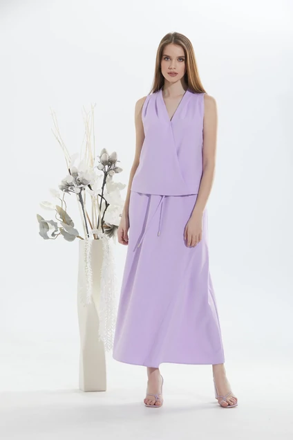 Юбка с небольшим расширением к низу, с притачным широким поясом на резинке и шнуром, которые регулируют степень прилегания. Переднее полотнище с косыми боковыми карманами и конструктивным подрезом.