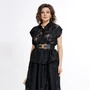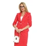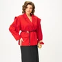 Комплект женский двух-предметный состоящий из жакета и юбки. Жакет женский полуприлегающего силуэта, на подкладке, с ассиметричной застёжкой на тесьму-молнию. Перед с притачными кокетками и рельефными швами, с прорезными карманами с молнией. Спинка с притачной кокеткой, средним швом и рельефными швами, понизу притачной пояс. Рукава втачные, двухшовные, длинные. Воротник отложной с отворотом. Жакет декорирован печатью по переду и рукавам. Юбка женская полу-солнце, на притачном поясе, с застёжкой на потайную тесьму-молнию в левом боковом шве. Переднее полотнище с косыми боковыми карманами. Юбка- костюмно-плательная 65% ПЭ, 32% вискоза