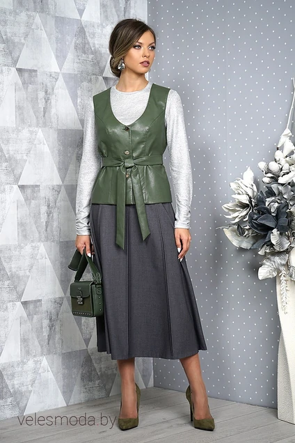 Жилет полуприлегающего силуэта с центральной застежкой на пробивные петли и пуговицы, на подкладке. Перед с рельефными швами. Спинка со средним швом и рельефными швами. Жилет с поясом из основной ткани. Длина жилета по среднему шву спинки – р46,48 -54,5, р50-55,5, р52-56,5 Ширина плеча – р46-8,7, р48-8,9, р50-9,1, р52-9,3 ОГ – р46—99, р48-103, р50-107, р52-111 ОТ – р46-90, р48-94, р50-99, р52-104 ОБ (по линии низа) – р46-104, р48-108, р50-112, р52-116 Блуза прямого силуэта из тоненького трикотажного полотна. Рукава втачные, одношовные, по низу – сборка. Длина блузы по среднему шву спинки – р46-59, р48-60, р50-61, р52-62 Длина рукава во всех р-ах -61 Ширина рукава на уровне глубины проймы ½ - р46-15,4, р48-16,3, р50-17, р52-17,7 ОГ – р46-93, р48-97, р50-101, р52-105 ОТ – р46-83, р48-87, р50-91, р52-95 ОБ (по низу) – р46-98, р48-102, р50-106, р52-110 Юбка полусолнце, на притачном поясе, застегивающемся на петлю и пуговицу. Застежка в левом боковом шве на потайную тесьму-молнию. Юбка без подкладки. Длина юбки – р46,48-79,5, р50,52-80 ОТ – р46-78, р48-82, р50-87, р52-92 ОБ – р46-112, р48-116, р50-120, р52-124 Состав: жилет: кожа вискоза 84%, пэ 16%, покрытие пэ 100%; блуза: трикотаж -пэ 70%, вискоза 26%, эластан 3%; юбка: костюмно-плательная ткань пэ 65%, вискоза 30%, эластан 5%