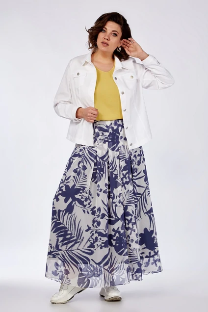 Описание: Женский юбочный костюм - идеальное решение для создания стильного и делового образа. Сочетание белого джинсового жакета с шифоновой юбкой из принтованной ткани. Жакет-куртка прямого кроя с рельефными швами и кокетками по переду и спинке, накладные карманы с клапанами и декоративные металлизированные пуговицы - узнаваемые нотки вневременной джинсовой мелодии. В рукавах предусмотрены паты с пуговицей, что позволяет сделать рукава короче. Комфортная, нарядная, длинная юбка-трапеция из шифона с обработанными бантовыми складками по талии. В боковой шов вставлена потайная молния. Юбка на поясе на петлю и пуговицу и частично на резинке. Лаконичный и элегантный фасон костюма позволит носить его в повседневной жизни, а также как праздничный или вечерний наряд. Покупая этот костюм, Вы приобретаете два полноценных изделия: жакет и юбку, благодаря которым можно сделать несколько образов . юбка: полиэстер - 95%, спандекс - 5%.