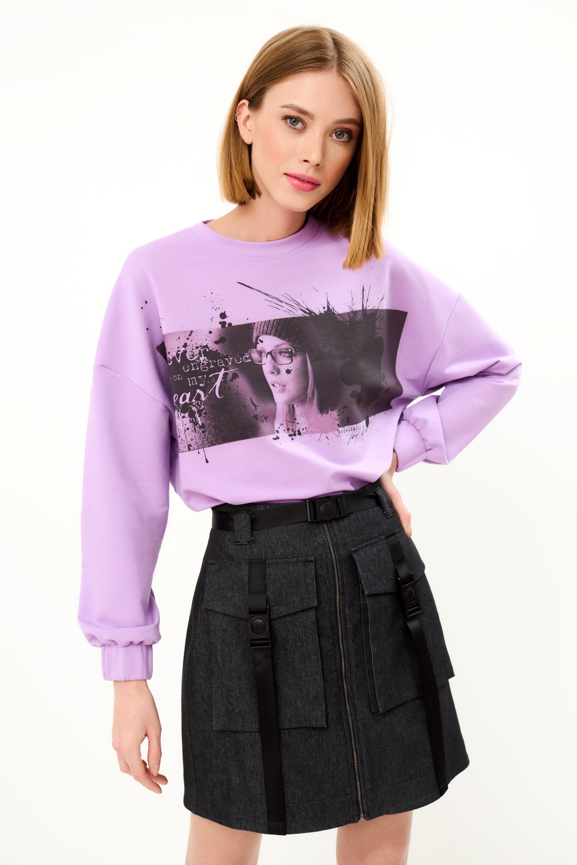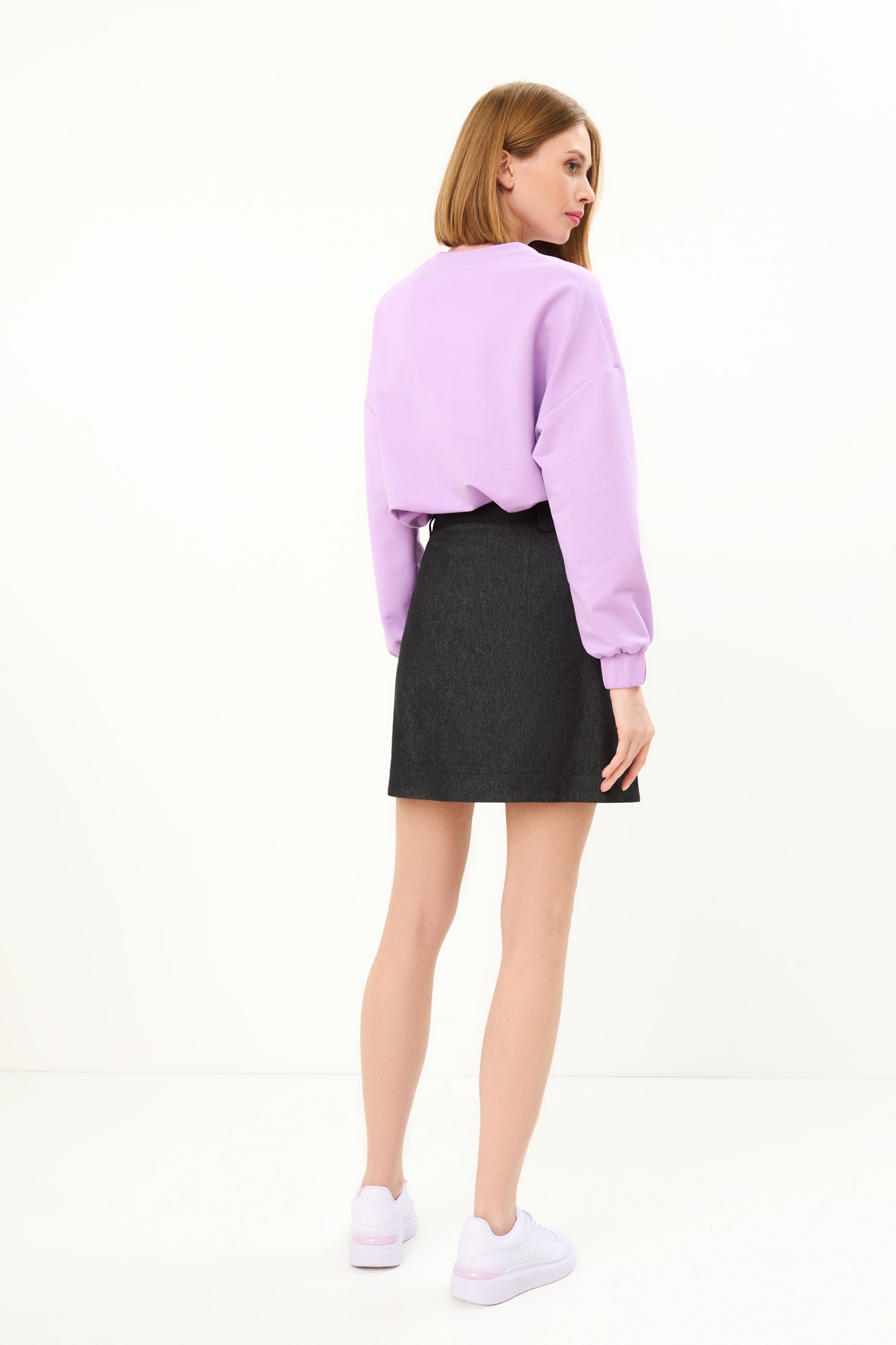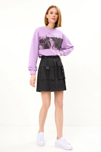 Комплект состоит из джемпера июбки. На полочку джемпера нанесена дизайнерская печать. Горловина джемпера и низ обработаны довязом. Плечо спушчено, рукав втачной. Юбка из джинсовой ткани на подкладке слегка расширенная к низу. По центру переднего полотнища юбки вставлена разъемная молния. Настрочены два кармана "книга"с клапаном в которые вставлена декоративная тесьма на декоративной застежке. Талия завышена с двумя вытачками по переднему и заднему полотнищу, настрочными шлевками в которые втянут декоративный пояс из тесьмы. Длина джемпера-63 см, юбки-45 см. Юбка: Хлопок 68%, ПЭ 28%, Эластан 4%