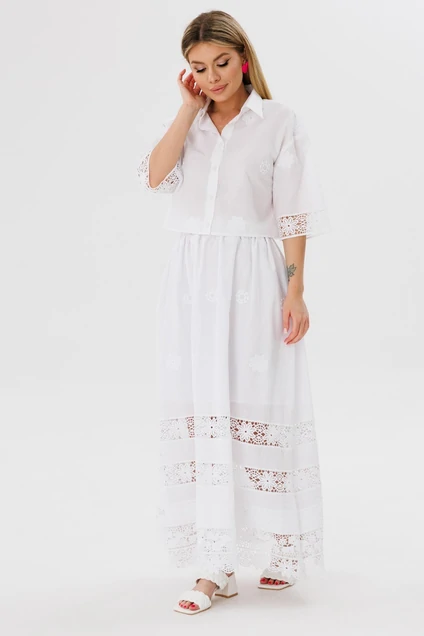 Рубашка укороченная, свободного силуэта,с центрально бортовой застежкой на петли пуговицы.Воротник на стойке отложной,рукав короткий.Юбка-колокол свободного силуэта. Юбка на подкладке