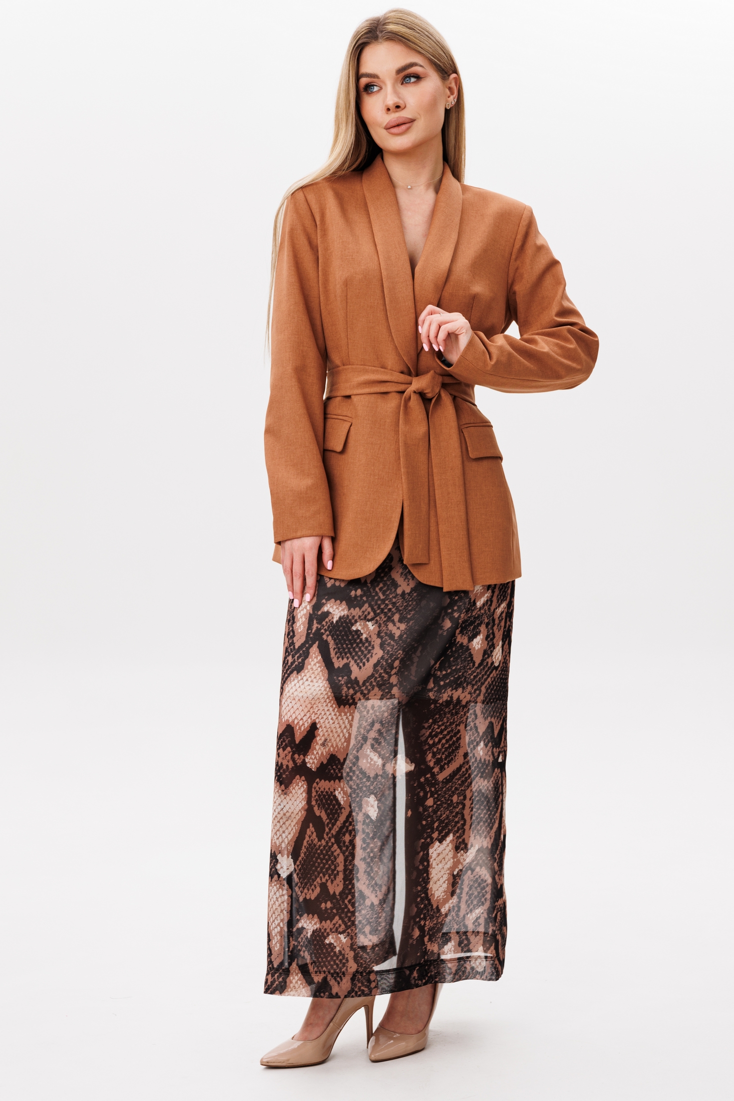 Элегантный женский костюм, включающий в себя жакет и юбку. Жакет выполнен в прилегающем силуэте с шальным воротником, подчеркнутым поясом из основной ткани. На передней части расположены действующие прорезные карманы с клапанами. Дизайн дополнен втачными двухшовными рукавами с отлетной шлицей по низу. Жакет на подкладке и застегивается на петлю и пуговицу. Юбка миди изящно расклешена к низу, с застежкой на потайную тесьму-молнию сзади. Притачной пояс обеспечивает идеальную посадку. Материал юбки украшен модным принтом в анималистическом стиле с бежево-коричневой цветовой гаммой, что создаёт отличный контраст с однотонным топом. Юбка также на подкладке, обеспечивая комфортное ношение. Данный костюм идеально подойдет как для офиса, так и для выхода в свет, благодаря своему стильному сочетанию цветов и текстур.