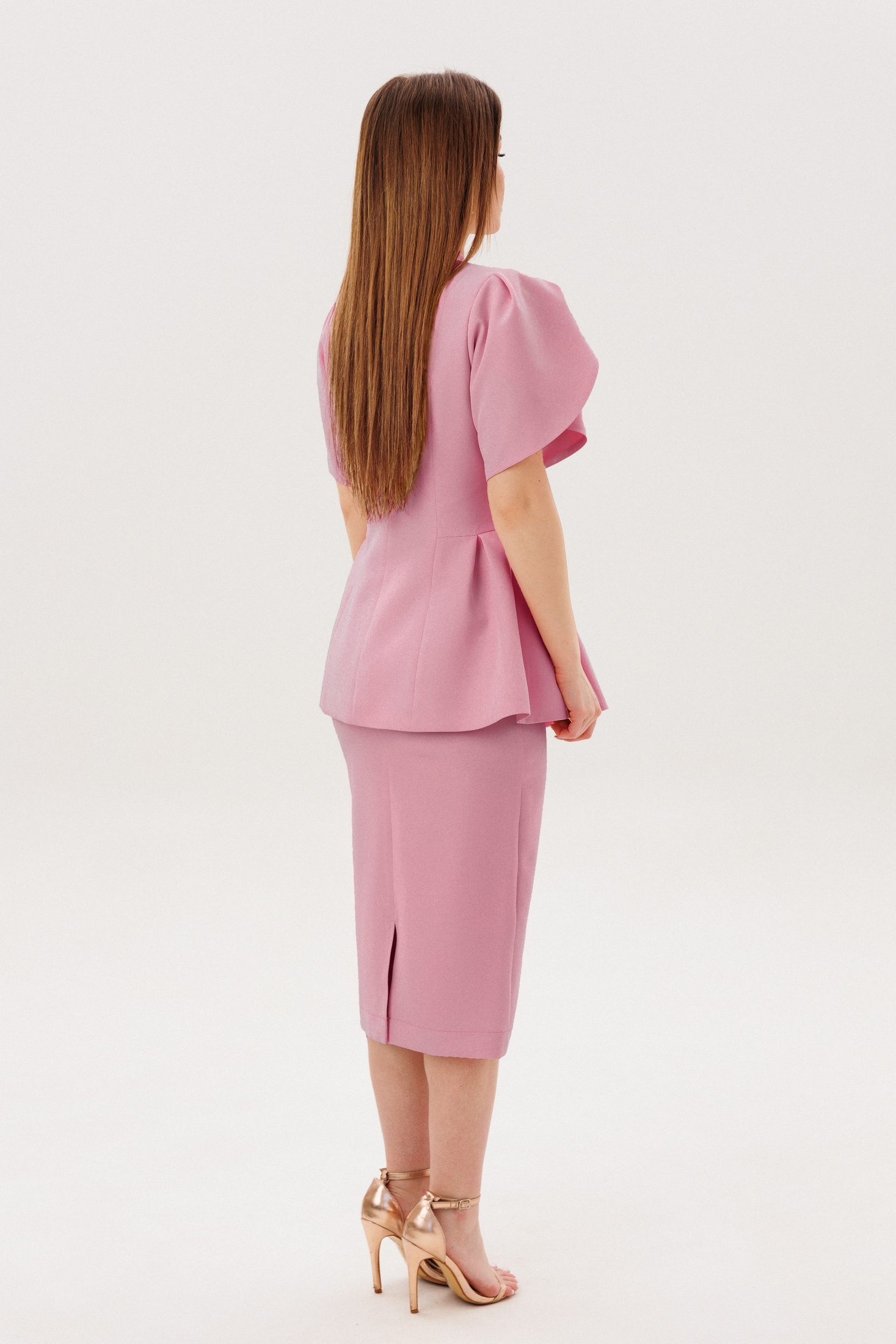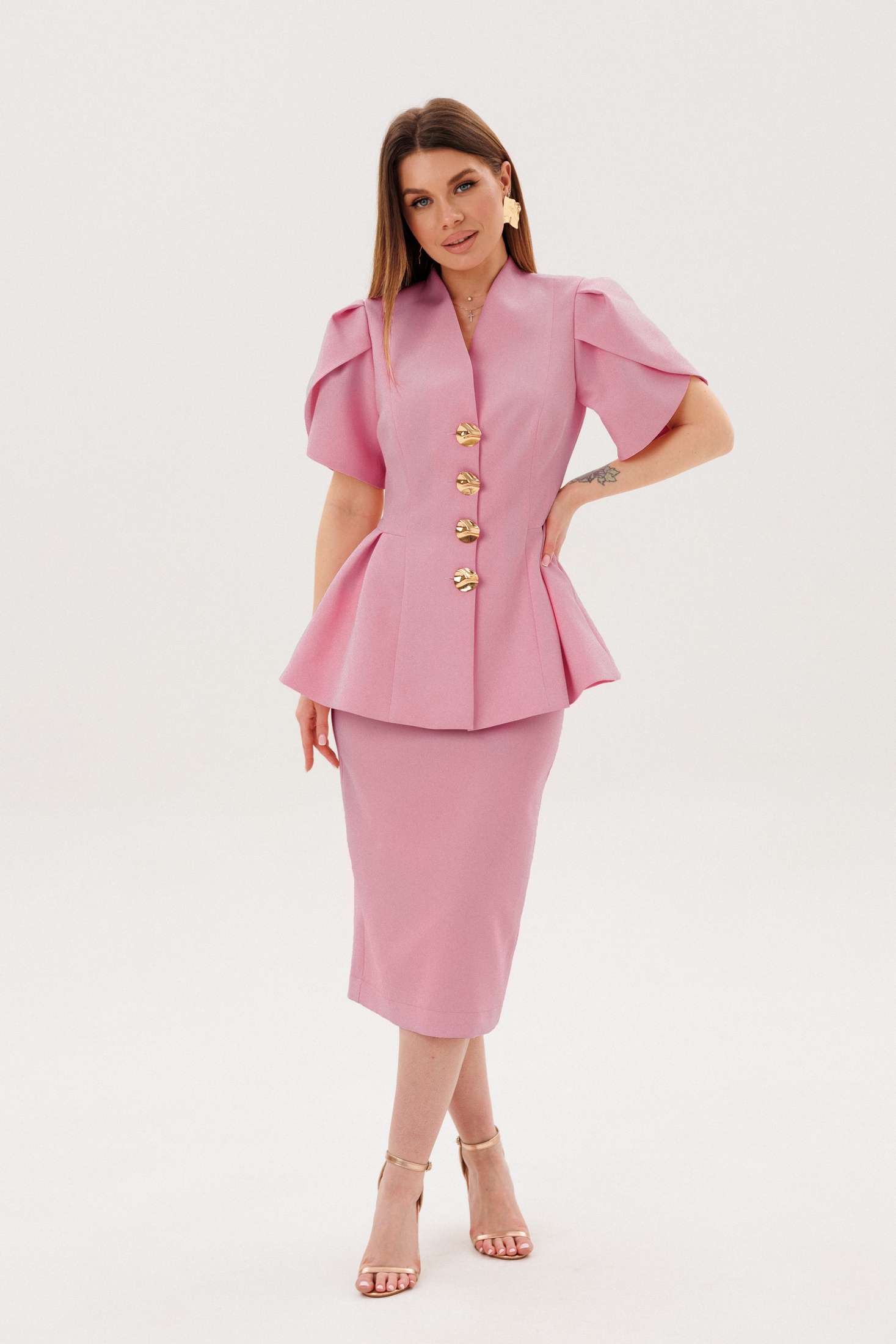 Костюм с юбкой 2157-2 пудра Ambera style - стильный выбор для впечатляющих образов. Коллекция бренда Ambera style предлагает приталенный костюм с жакетом на подкладке, украшенным изысканными металлическими пуговицами. Рукава-фонарики придают особый шарм, а баска по низу жакета добавляет элегантности. Юбка-карандаш с потайной молнией и разрезом сзади обеспечивает комфорт и лёгкость движения. Комплект выполнен из костюмной ткани, что делает его идеальным для офиса и повседневных деловых встреч. Пудровый цвет подчеркнёт вашу женственность в любое время года. Наслаждайтесь универсальным и продуманным дизайном, который сочетается с грацией и стилем.