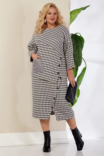 Комплект женский 2-х предмеиный ( блузка, юбка) из текстилькой ткани. Блуза прямого силуэта со спущенным плечом, низ по полочке фигурный, симметричный. По полочке идет кокетка в виде подреза, отделка в виде пуговиц и накладной карман (из эко-кожи). По спинке средний шов, рукав 3/4 длины. Юбка зауженная к низу, по полочке идет ассемитричный подрез с пуговицами. По спинке средний шов, шлица , пояс отрезной с резинкой. Длина блузы (по спинке):(50-54)- 59см, (56-60)-62 см. Длина рукава: (50-60)-33см. Длина юбки: (50-60):-73см.