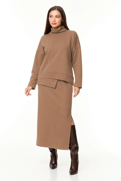 Комплект женский 2-х предмеиный ( блузка, юбка) из трикотажного полотна футер. Очень теплый. Идеальный на холодную погоду. Блуза прямого силуэта со спущенным плечом, низ по полочке фигурный, асимметричный и подрез в виде запаха. По низу снинки и полочки идет отрезной пояс. Юбка макси зауженная к низу, по бокам разрезы, пояс отрезной на резинке. Длина блузы (по спинке):(50-54)- 61см, (56-60)-63 см. Длина рукава: (50-60)-45см. Длина юбки: (50-60):-90см.