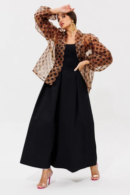 Шикарный комплект женский 2-х предметный от бренда Anastasia, идеальный для любого случая. Этот комплект сочетает в себе элегантность и комфорт . Туника прямого силуэта из органзы в горохи со спущенной линией плеча. Рукав двойной, расширенный к низу со складками. По спинке и полочке идет планка. С ее помощью легко можно трансформировать повседневный образ в праздничный. Юбка А-образного силуэта в пол на подкладке. По подкладке идет валан, для поддержания обьема юбки. По переду и спинке по центру идет встречная складка, по бокам- односторонние. По спинке застежка молния. В комплект входит сьемный пояс. Длина туники по спинки(48-56)-66 см. Длина рукава: (48-56)-53см. Длина юбки 99 см