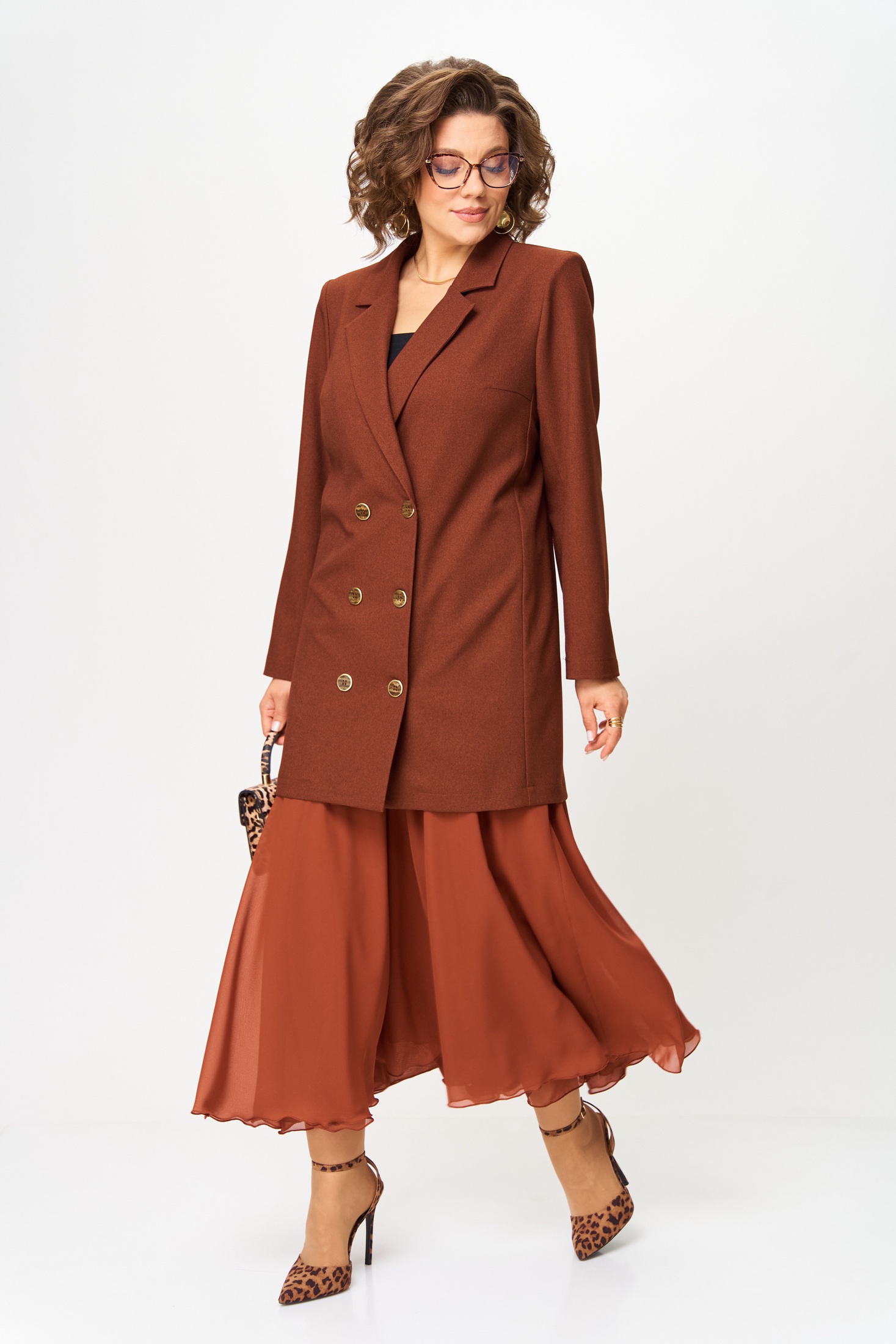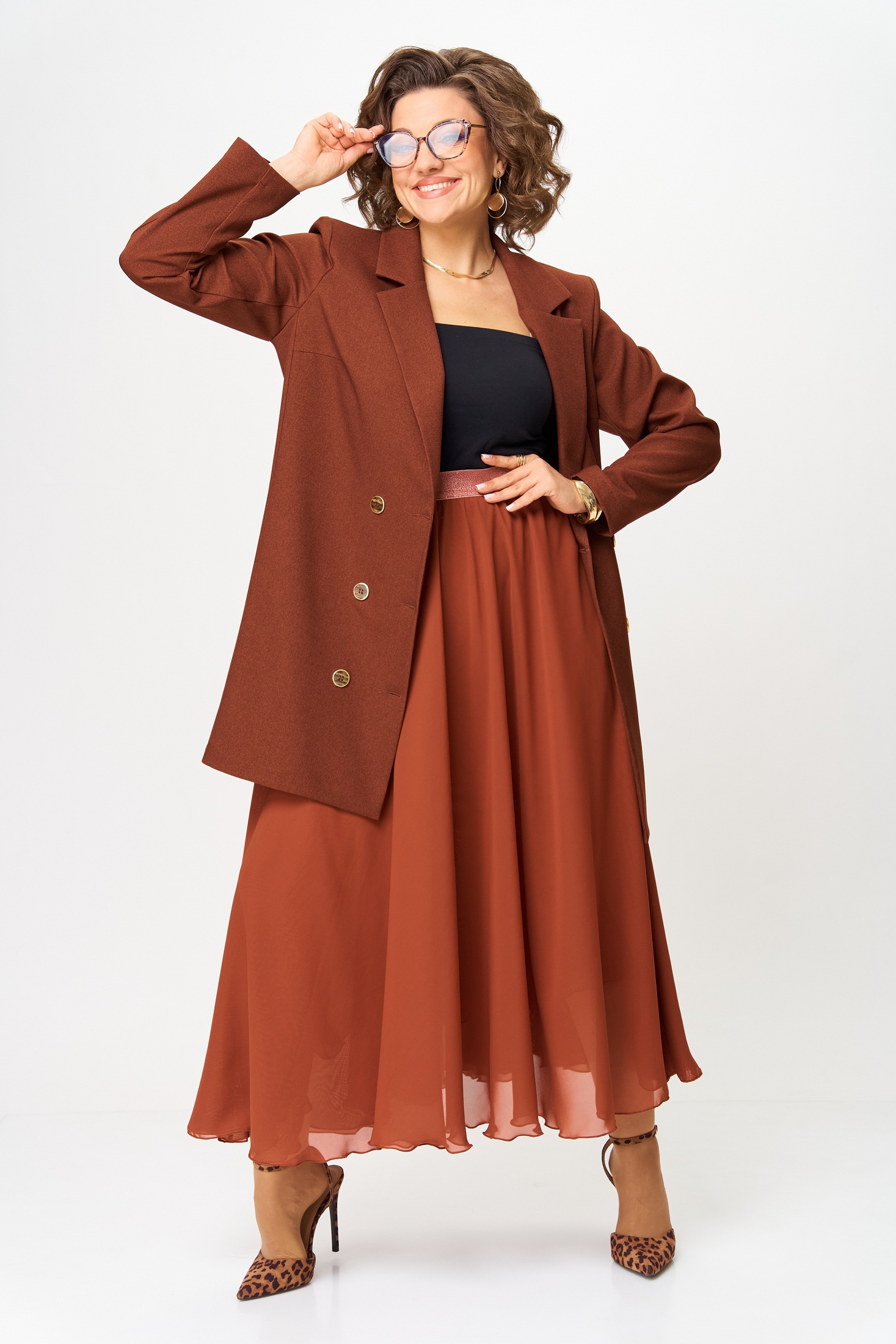 Костюм с юбкой 1262-3 терракот Anastasia — это выбор для стильных и уверенных в себе женщин. Коллекция бренда Anastasia предлагает изделие из премиум материалов: сочетание шерсти и полиэстера обеспечивает легкость и тепло, а двойной шифон юбки добавляет воздушности. Удлиненный пиджак и макси юбка создают как вечерние образы, так и строгие луки для офиса. Пиджак с пуговицами двубортной застежки и приталенного силуэта подчеркивает фигуру. Терракотовый цвет делает костюм универсальным, а длина пиджака (48-52)-83см, (54-56)-86 см позволяет носить его как платье. Длина рукава:(48-52)-60см, (54-56)-62см. Длина юбки составляет 98 см. Комплект идеально подходит для осени, его элементы легко комбинируются с другими вещами вашего гардероба.
