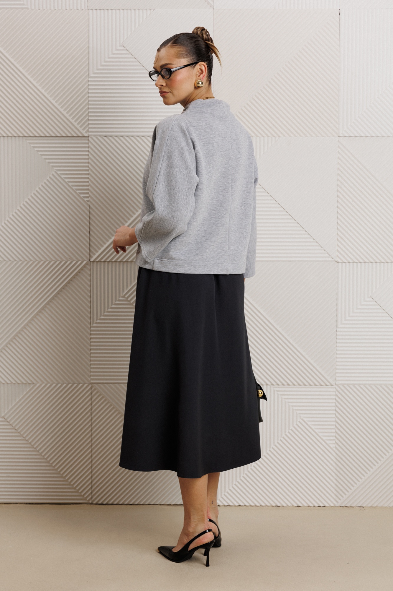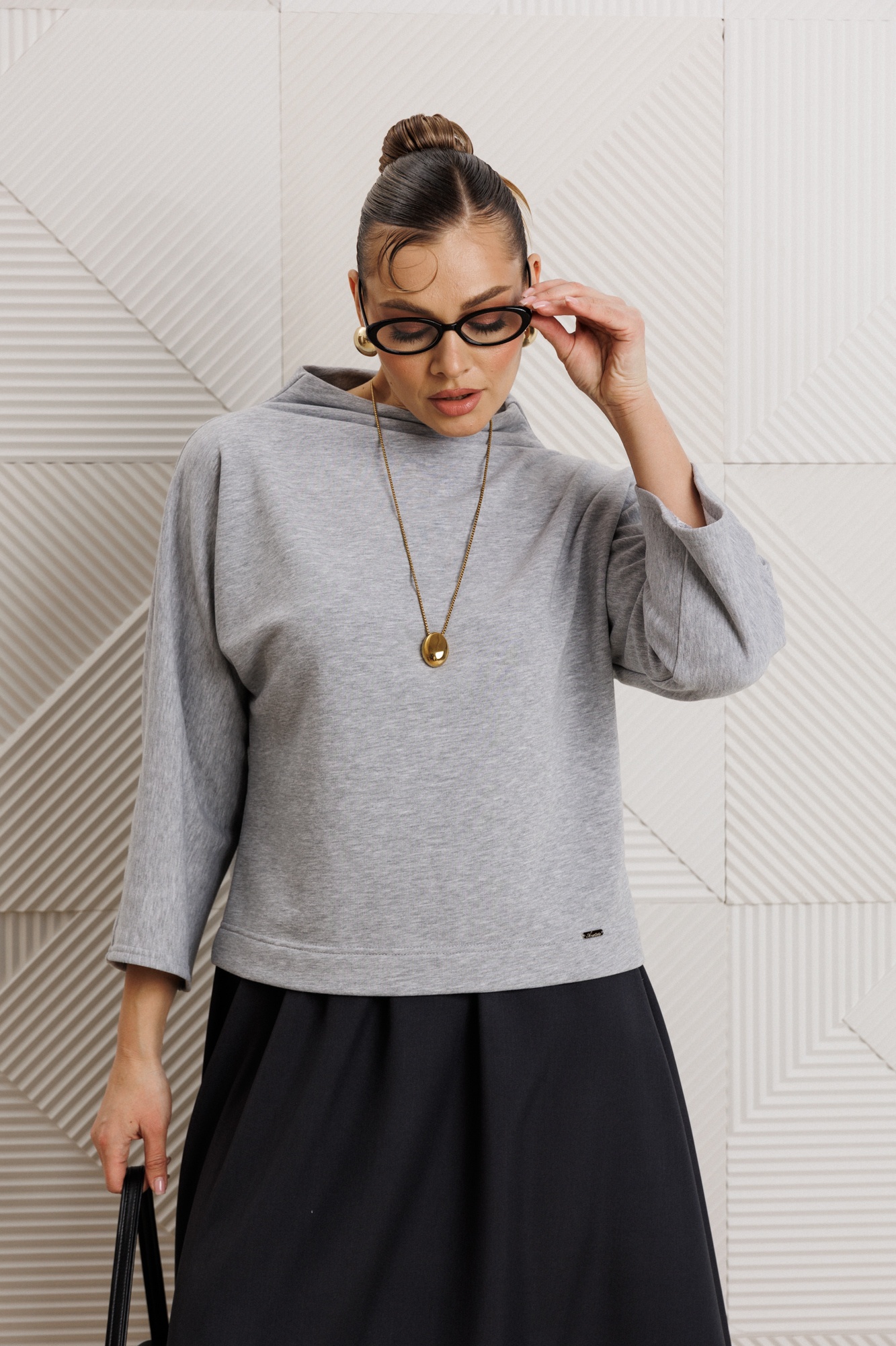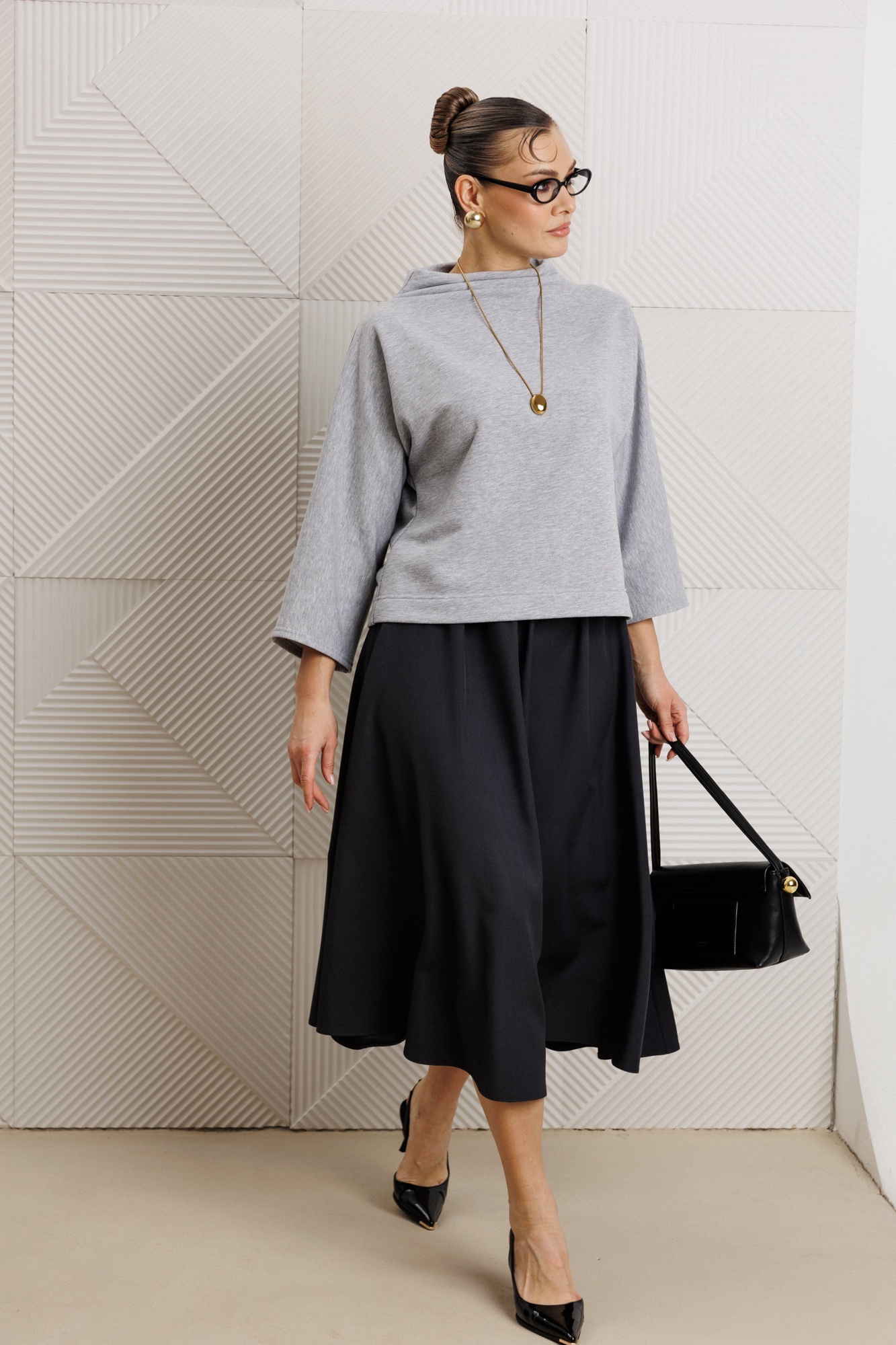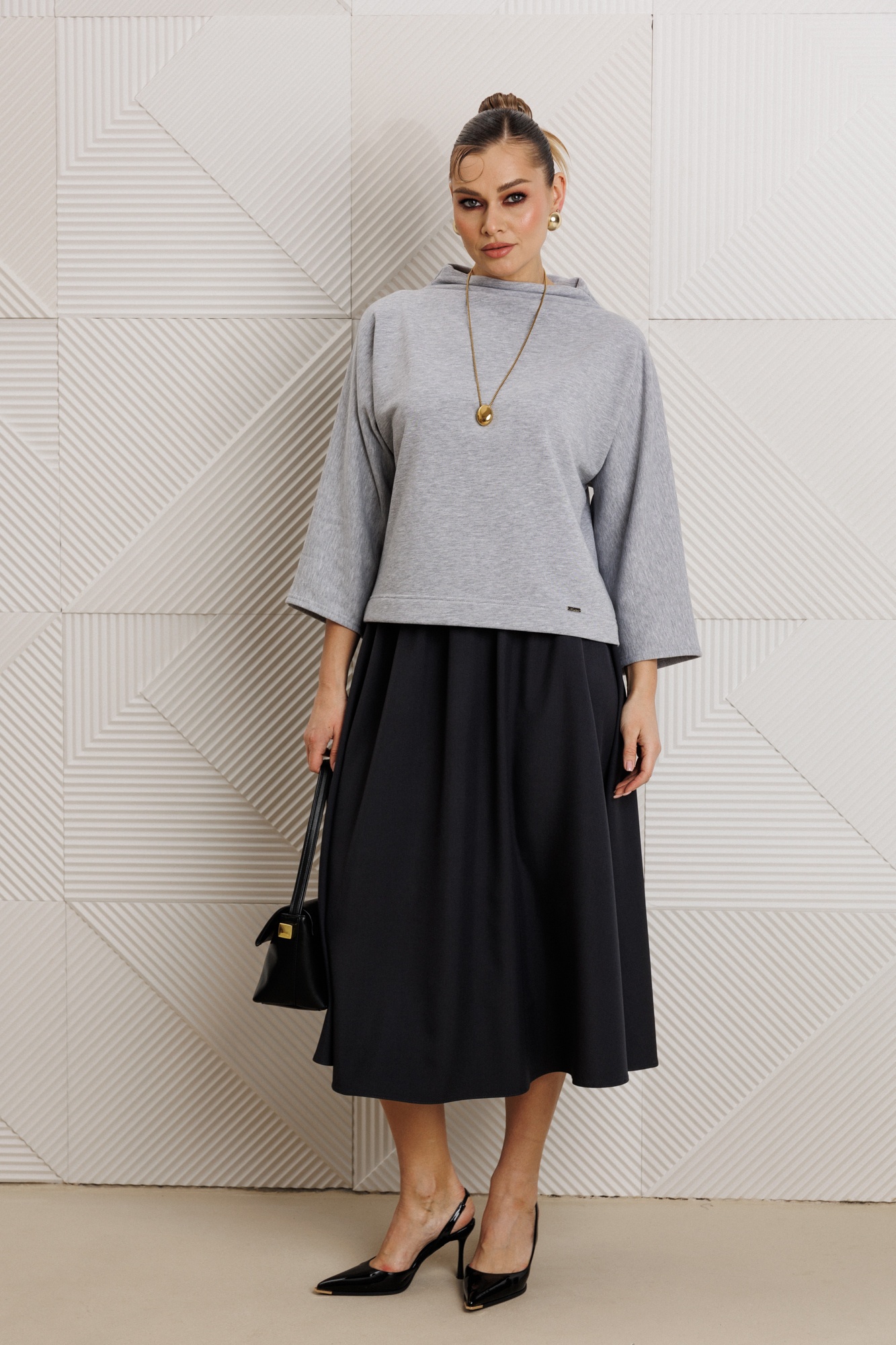 Костюм с юбкой 1319 Anastasia — уникальное сочетание стиля и комфорта для вашего повседневного образа. Коллекция бренда Anastasia предлагает женский костюм, включающий блузку и юбку. Блузка из трикотажного материала со спущенным плечом и рукавом 3/4 обеспечивает свободу движений и подходит для офисного и повседневного стиля. Горловина стойка подчёркивает современный стиль. Юбка расширенная к низу с поясом на резинке удобна для длительного ношения. Серый верх и тёмная юбка создают универсальный ансамбль, подходящий для любого сезона. Длина блузки составляет 60 см, а юбки — 85 см, что делает этот комплект идеальным выбором для женщин любых форм.