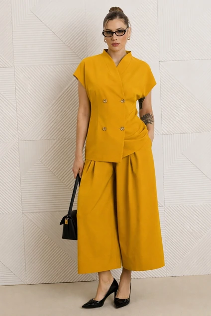 Костюм с юбкой 1330 медовый Anastasia привносит яркие акценты в ваш гардероб. Коллекция бренда Anastasia включает этот изысканный костюм двойку, выполненный из костюмной ткани с полиэстером, вискозой и спандексом. Жилет полуприлегающего силуэта подчеркивает женственные формы и обеспечивает комфорт, а юбка-брюки с встречными складками добавляет стильный объем. Двухбортная застежка и цельнокроеная стойка ворота создают утонченный вид, а потайная молния в юбке-брюках гарантирует идеальную посадку. Костюм медового цвета идеально подходит для теплой весны и лета, делая его незаменимым для работы, офиса и прогулок. Длина по спинке составляет 72 см (48-52) и 74 см (54-58), а длина юбки-брюк — 85 см, что добавляет практичности вашему образу.