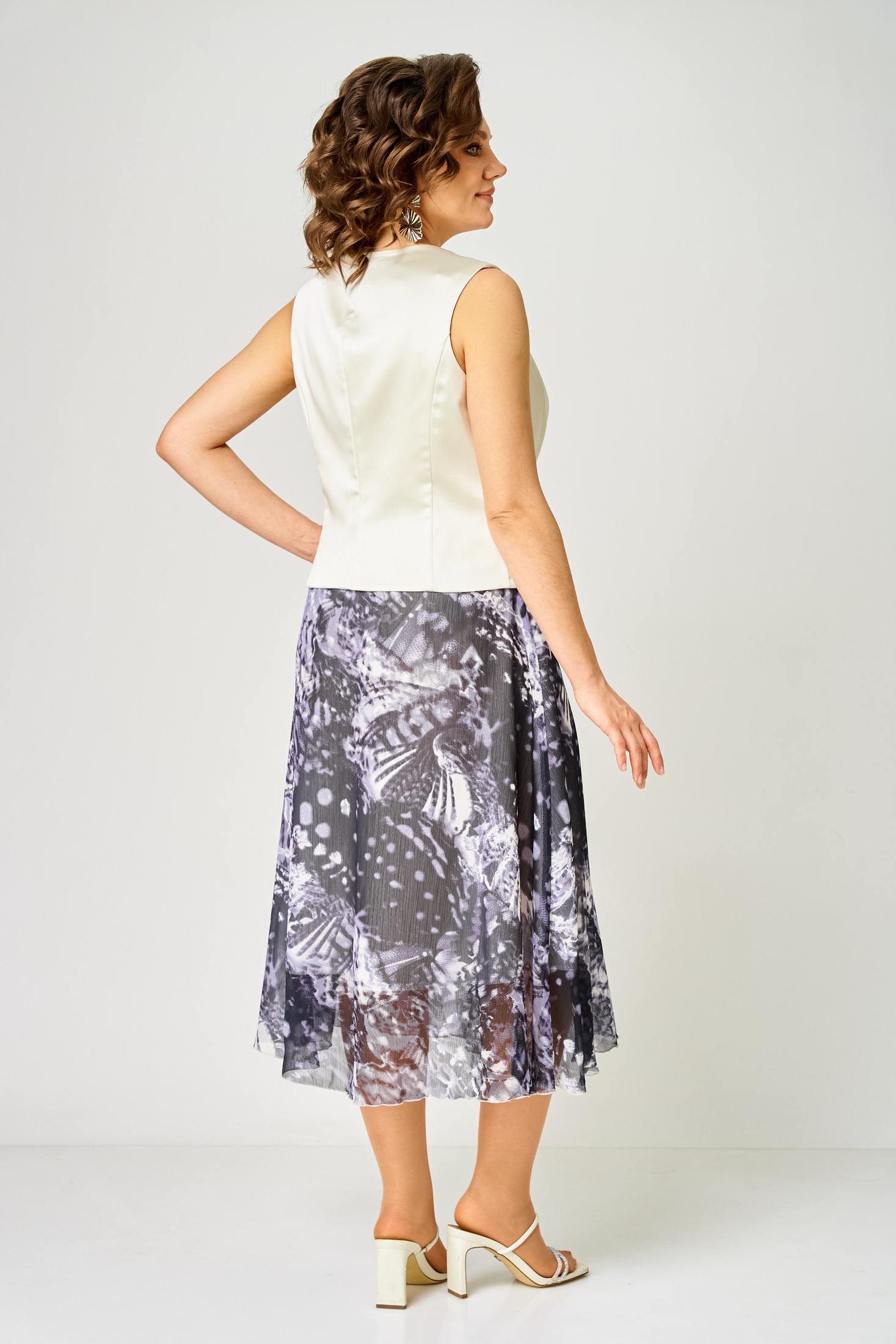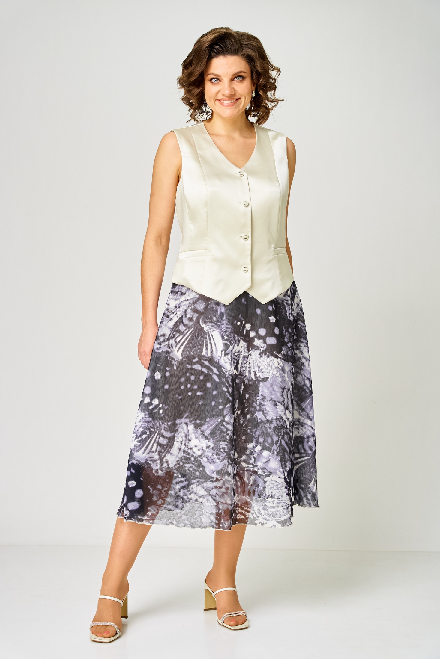 Костюм с юбкой 1251-С молочный + мультиколор ANASTASIA MAK идеально подходит для теплого сезона. Коллекция бренда ANASTASIA MAK сочетает в себе изысканный жилет из однотонной атласной ткани и юбку А-силуэта из шифона 'крэш' с ярким набивным рисунком. Жилет полуприлегающего силуэта с прорезным карманом и V-образной горловиной придает изделию модный акцент. Юбка с притачным поясом и эластичной тесьмой обеспечивает удобную посадку. Потайная молния в левом боковом шве облегчает надевание. Стильный комплект выполнен в молочном и мультиколор оттенках, что делает его идеальным выбором для повседневных и прогулочных образов.