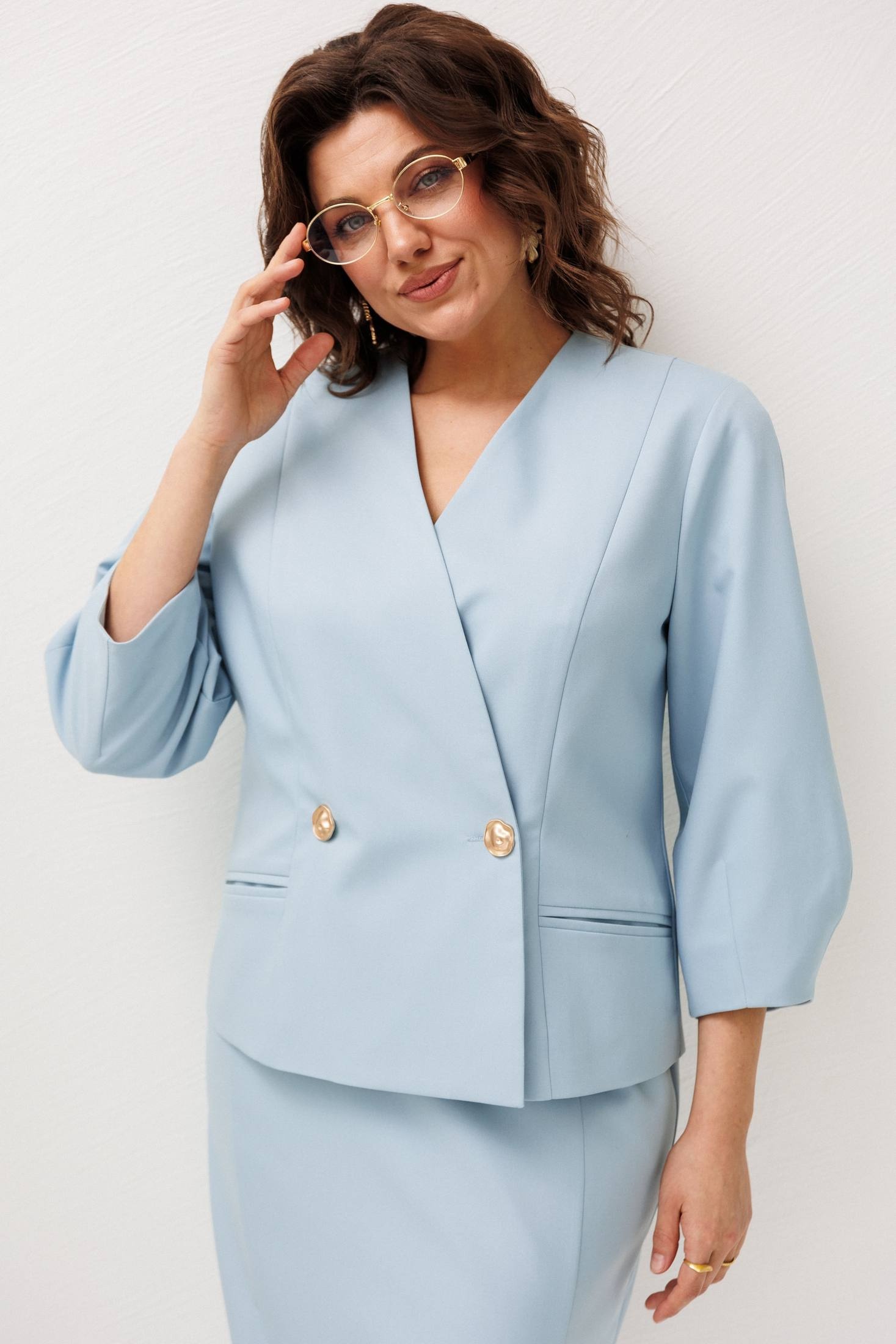 Костюм с юбкой 1844 голубка Anelli — воплощение женственности и стиля. Коллекция бренда Anelli представлена в нежном голубом оттенке «голубка», который придаёт образу лёгкость и уверенность. Костюм выполнен из вискозы и полиэстера, что обеспечивает комфортную посадку и приятные тактильные ощущения благодаря подкладке. Жакет полуприлегающего силуэта подчёркивает фигуру, а V-образный вырез добавляет утончённости. Золотые пуговицы становятся акцентом, придавая наряду благородное сияние. Юбка с рельефами и мягким поясом с резинкой по бокам обеспечивает свободу в движении. Шлица добавляет лёгкости шагу. Идеальный комплект для офиса, встреч и повседневных образов. Этот костюм универсален: его элементы можно комбинировать с другими вещами из гардероба, создавая разнообразные стильные образы.