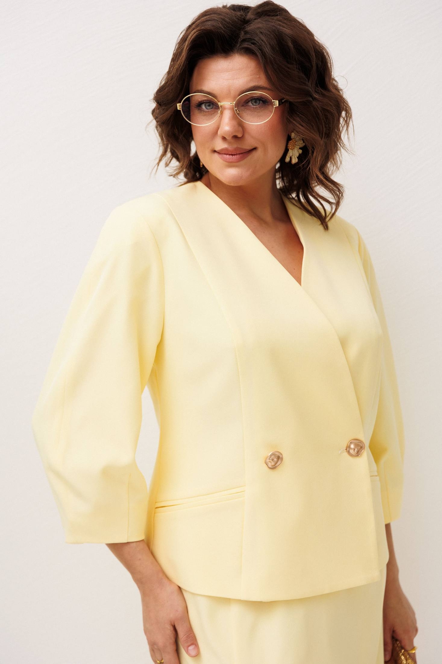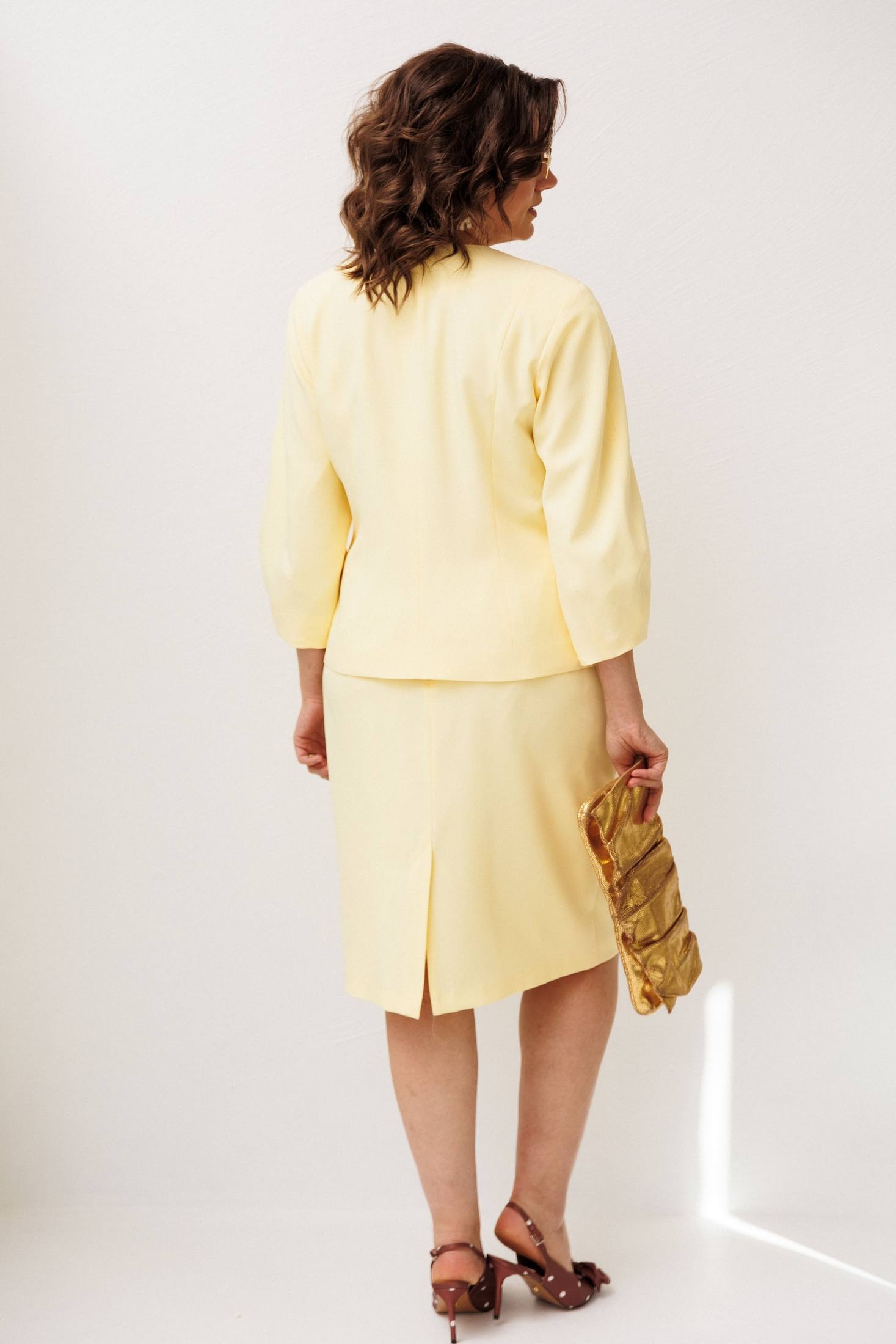 Костюм с юбкой 1844 иволга Anelli сочетает в себе мягкость вискозы и полиэстера, создавая комфорт и легкость. Коллекция бренда Anelli представляет женственный комплект в нежном желтом оттенке. Полуприлегающий жакет с V-образным вырезом украшен золотыми пуговицами, а также обладает длинными рукавами, подходящими для любого сезона. Юбка с рельефами и резинкой по бокам комфортна для повседневного ношения. Шлица добавляет свободы движению. Идеальный выбор для работы и встречи, создающий уверенный образ.