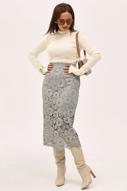 Идеальный выбор для модных девушек и женщин - комплект, состоящий из укороченного джемпера с рукавами-перчатками и кружевной юбки-карандаш.