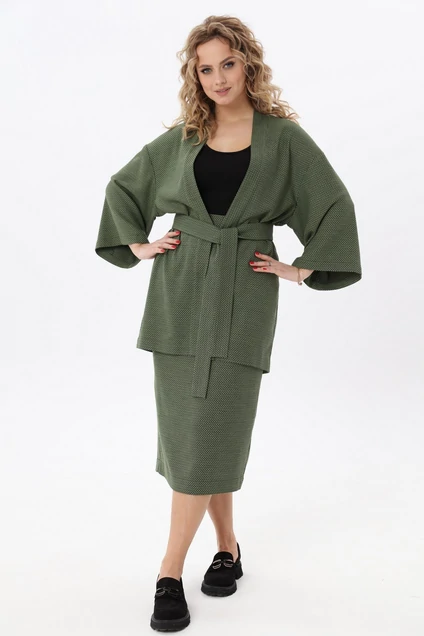 Женский комплект-двойка из плательной ткани состоит из жакета-кимоно и юбки-карандаш. Комплект будет отлично смотреться с обувью на каблуке, так и без каблука. И жакет, и юбку можно смело комбинировать с другими вещами из Вашего гардероба для создания повседневных луков. Мягкий и удобный комплект поможет чувствовать себя комфортно везде: на работе или учебе, в путешествии и на отдыхе. Длина жакета: 86 см