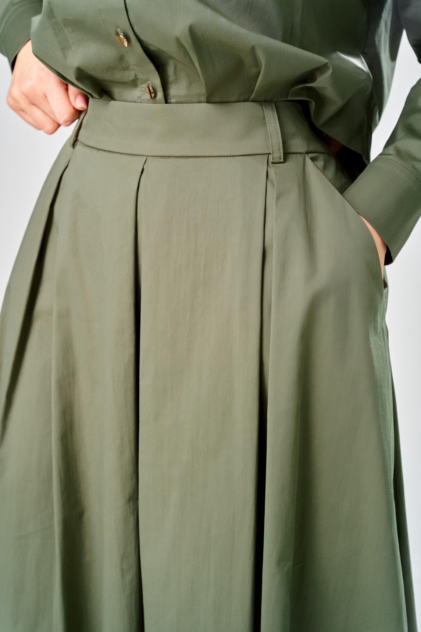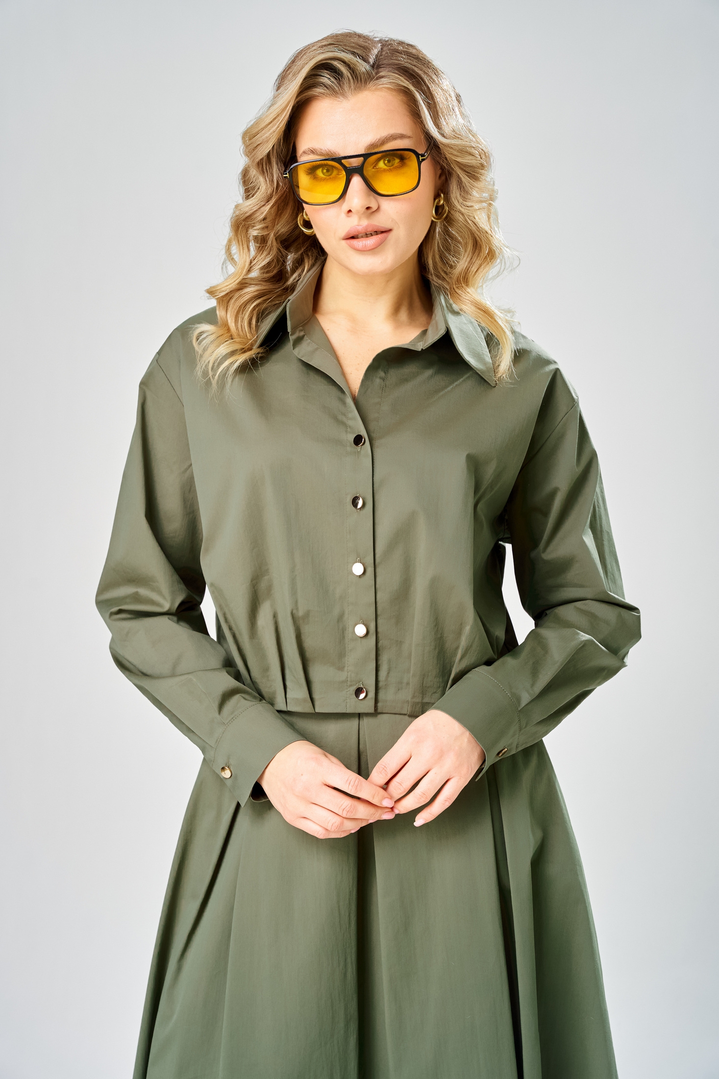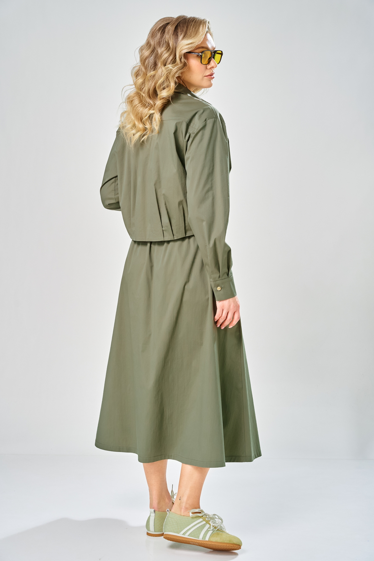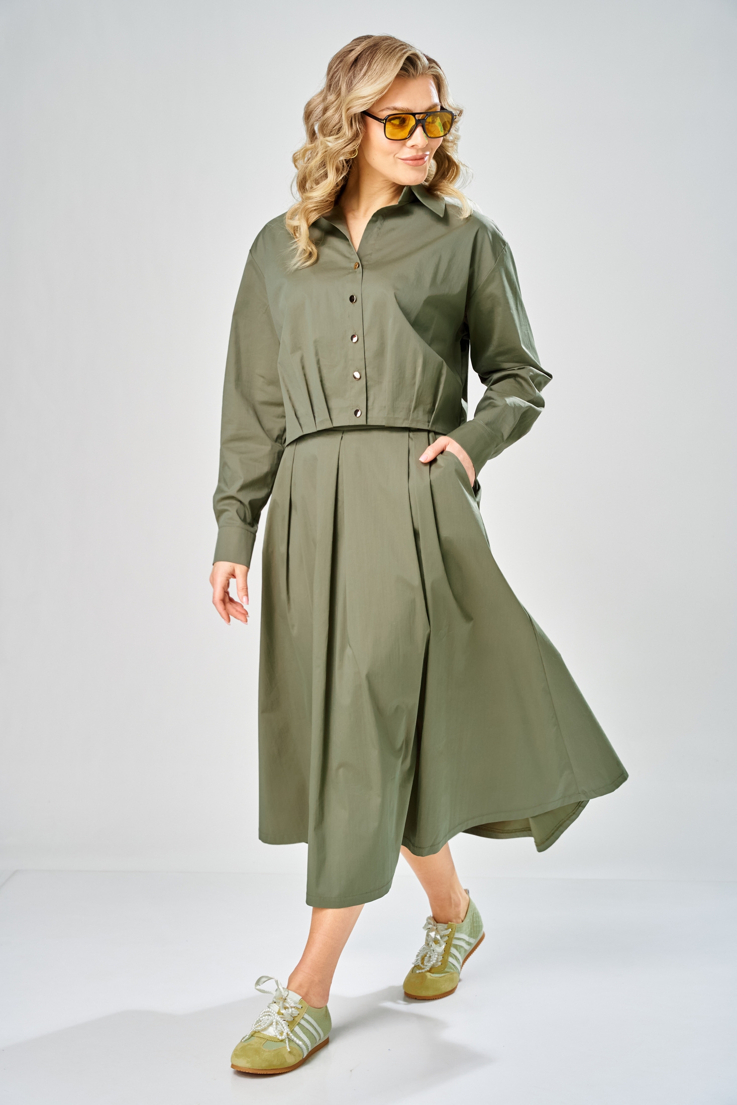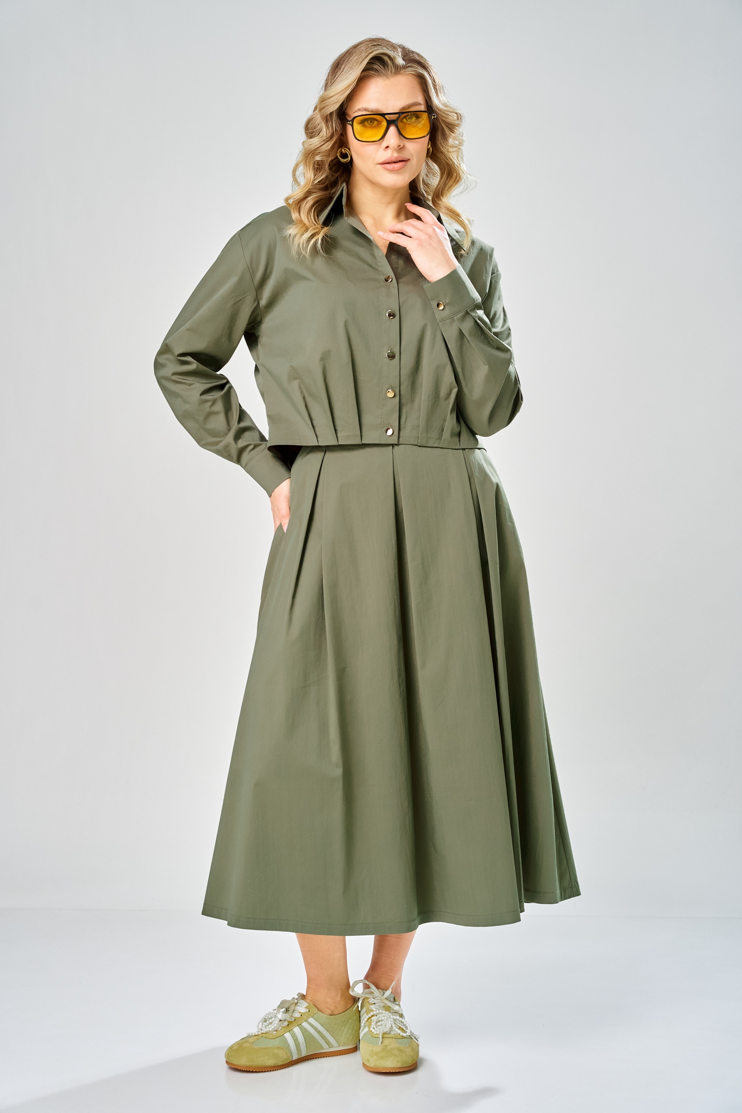Костюм с юбкой 1010 хаки ARTELLA сочетает в себе стиль и комфорт, идеально подходя для офисных и повседневных образов. Коллекция бренда ARTELLA выполнена из хлопкового текстиля с добавлением нейлона и спандекса, что обеспечивает комфорт и свободу движений. Блуза прямого силуэта с длиной 52 см имеет центральную застежку с 5 пуговицами и аккуратный отложной воротник. Длинные рукава с манжетами и боковые разрезы подчеркивают стильный офисный имидж. Юбка миди фасона А-силуэта с длиной 88 см и потайной молнией в боковом шве дополняет образ. Благодаря универсальному оттенку хаки, костюм подходит для весеннего и осеннего сезонов, обеспечивая легкость и удобство в любой обстановке.