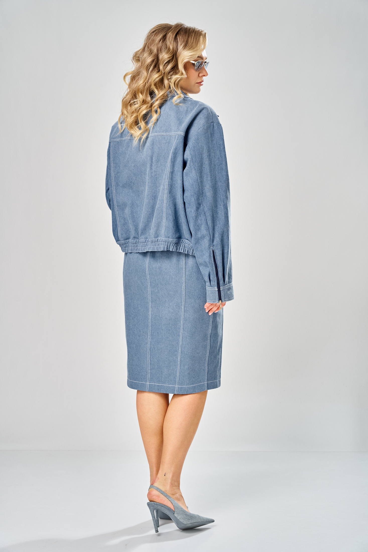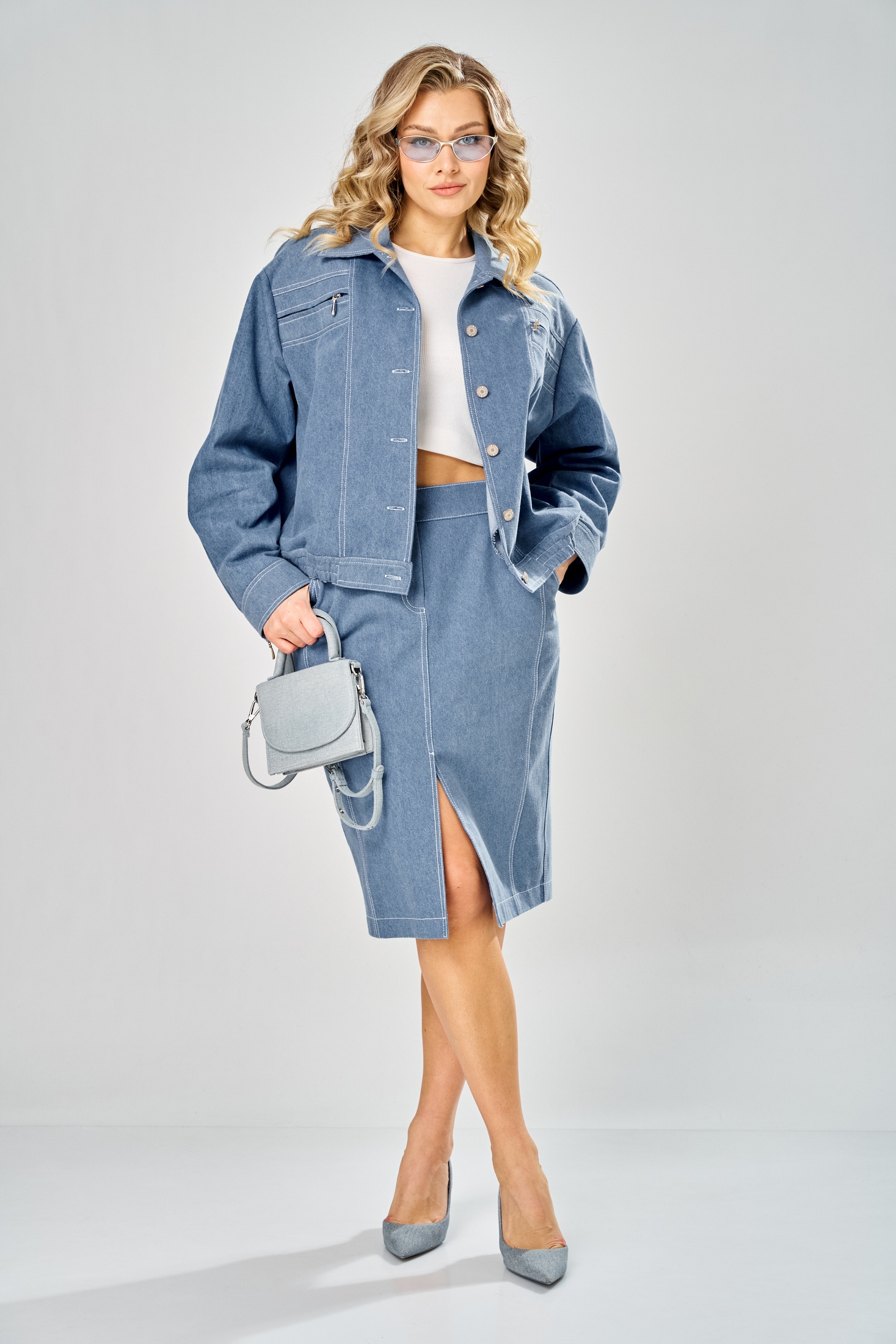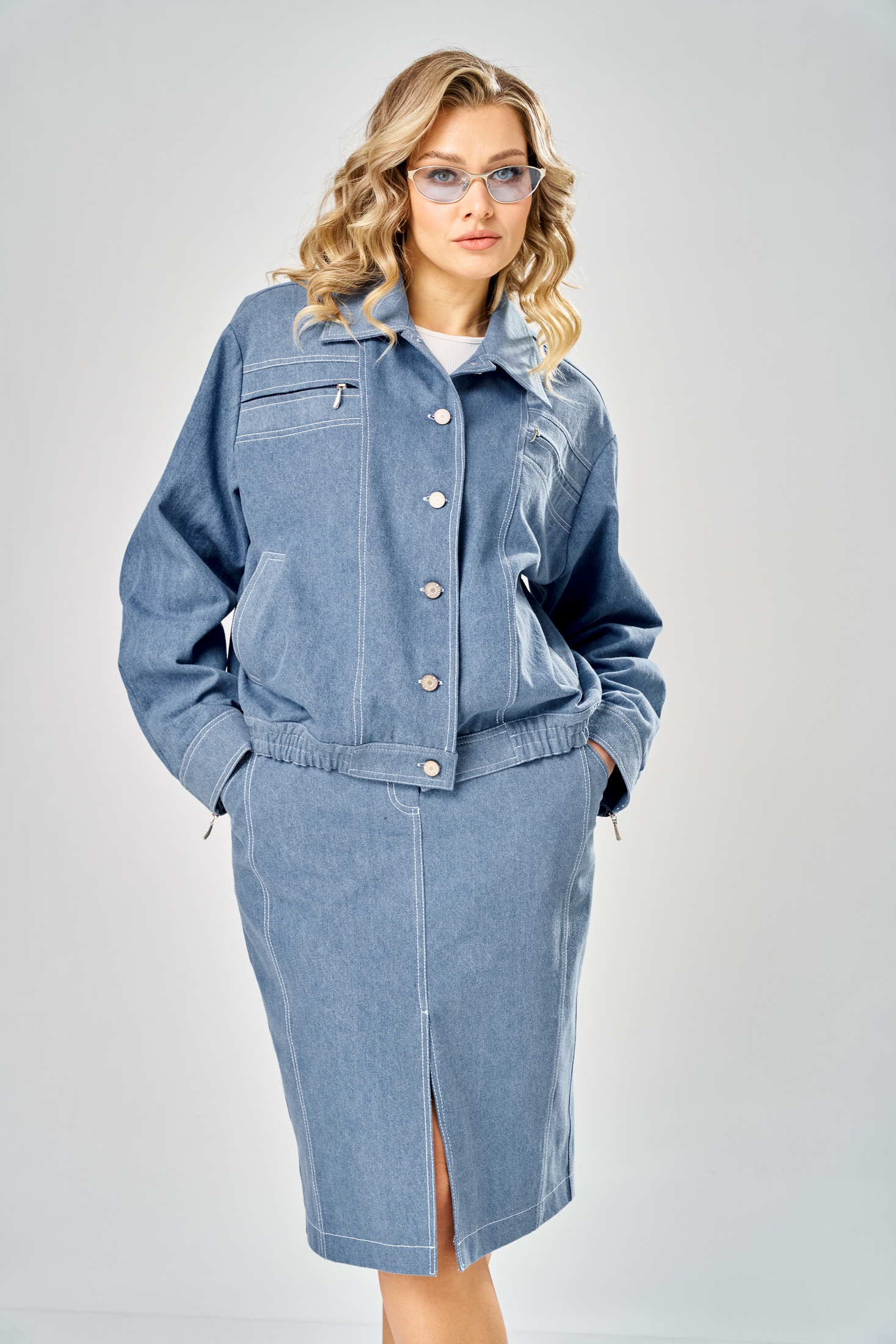Костюм с юбкой 1049 голубой ARTELLA — это стильный комплект из джинсовой ткани, включающий куртку и юбку. Коллекция бренда ARTELLA предлагает свободный силуэт с курткой на спущенной линии плеча и центральной бортовой застежкой на пуговицах. Воротник отложной, а спинка и перед выполнены с рельефными деталями и декоративными элементами. Прорезные карманы с листочкой, а также декоративная тесьма-молния придают уникальности. Длина куртки составляет 59 см, а юбка миди заужена к низу и оснащена застежкой на молнии спереди. Эластичная тесьма на поясах обеспечивает дополнительный комфорт. Это идеальный выбор для весенне-летнего сезона. Голубой цвет делает костюм универсальным для разных стилей — от повседневного до прогулочного.