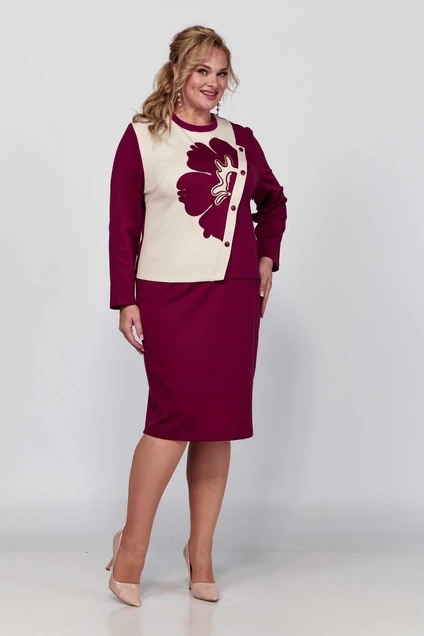 Костюм юбочный (двойка) женский полуприлегающего силуэта состоят из блузки и юбки. Блузка с длинным рукавом. По переду асимметричный рельеф с планкой на пуговицы. По центру переда аппликация в виде цветка с пайетками. Нагрудные вытачки из бокового шва. Спинка свободная. Юбка на поясе с резинкой. Застежка сзади на тесьму-молнию. По центральному шву заднего полотнища шлица. Юбка на подкладке.
