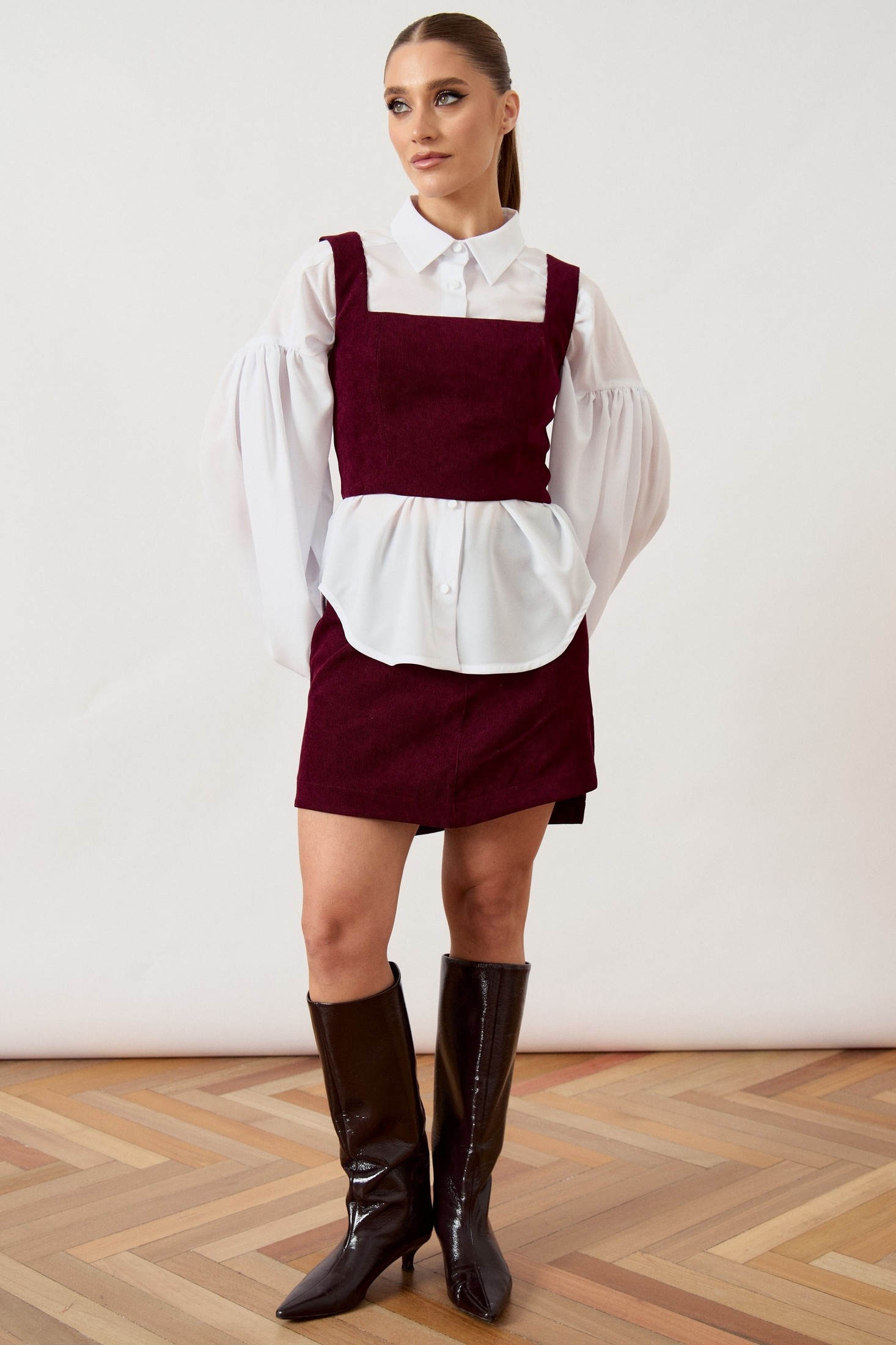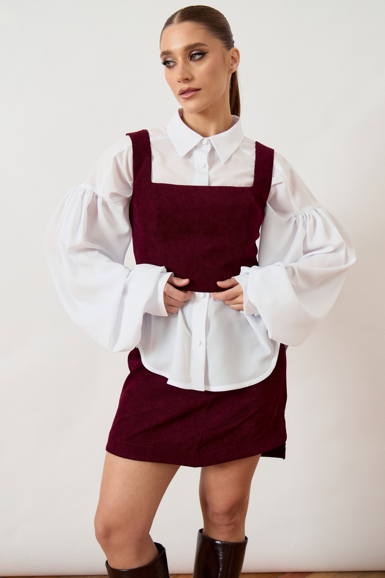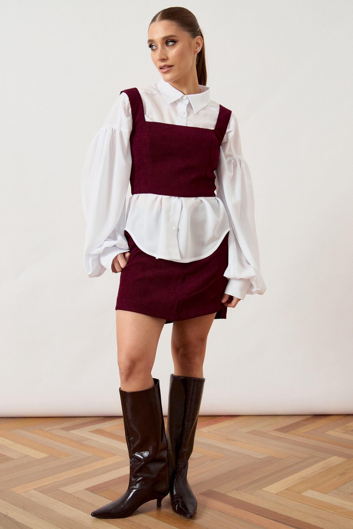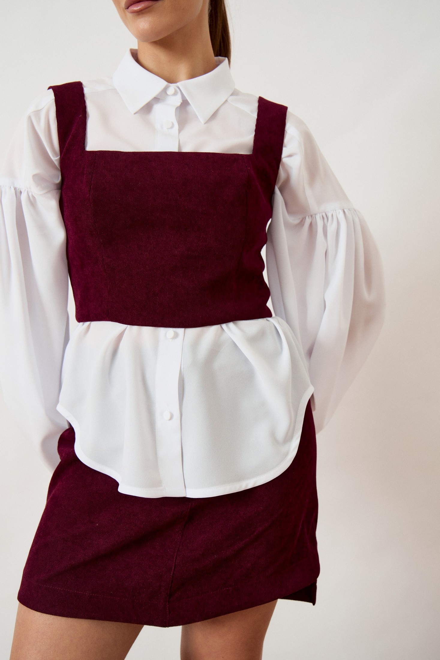 Костюм с юбкой 3489 ATTIKA отразит ваше чувство стиля благодаря своему модному дизайну и насыщенному винному оттенку. Коллекция бренда ATTIKA выполнена из плотной фактурной ткани, которая сохраняет форму и подчеркивает фигуру. Топ приталенного силуэта с квадратным вырезом на широких бретелях и мини-юбка с классической посадкой образуют гармоничный комплект. Потайная застежка-молния и притачной пояс добавляют функциональности и удобства. Комплект представлен в сочетании с контрастной белой блузой (арт. 3503) свободного кроя с объемными рукавами, что подчеркивает современный многослойный образ. Блуза в комплект не входит.