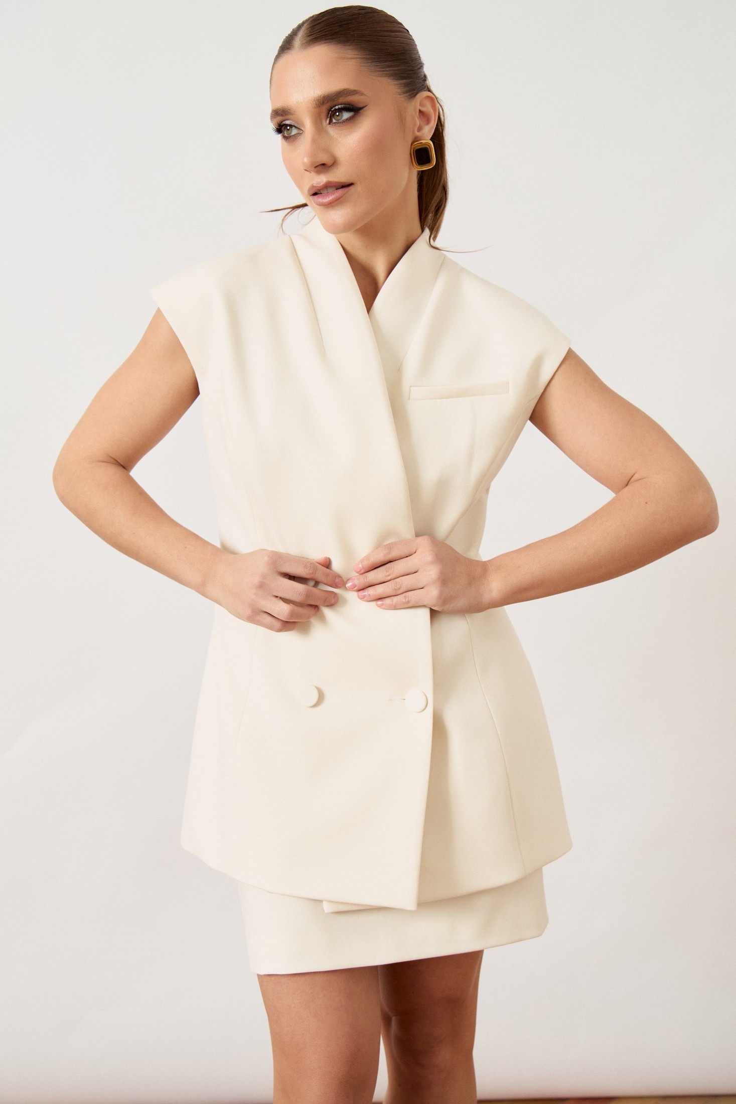 Костюм с юбкой 3491 ATTIKA включает в себя жилет и юбку, формируя стильный и современный образ. Коллекция бренда ATTIKA предлагает этот комплект из прочной костюмной ткани, который идеально подходит для многих случаев. Жилет полуприлегающего силуэта с V-образным вырезом и декоративным карманом на груди имеет двубортную застежку и стильные талиевые вытачки. Прочной подкладкой обеспечивается дополнительный комфорт и форма изделия. Цвет комплекта молочный, что подчеркивает его универсальность. Этот костюм удачно впишется в деловой и классический гардероб, идеален для офисных или торжественных мероприятий и сезона весна-лето.
