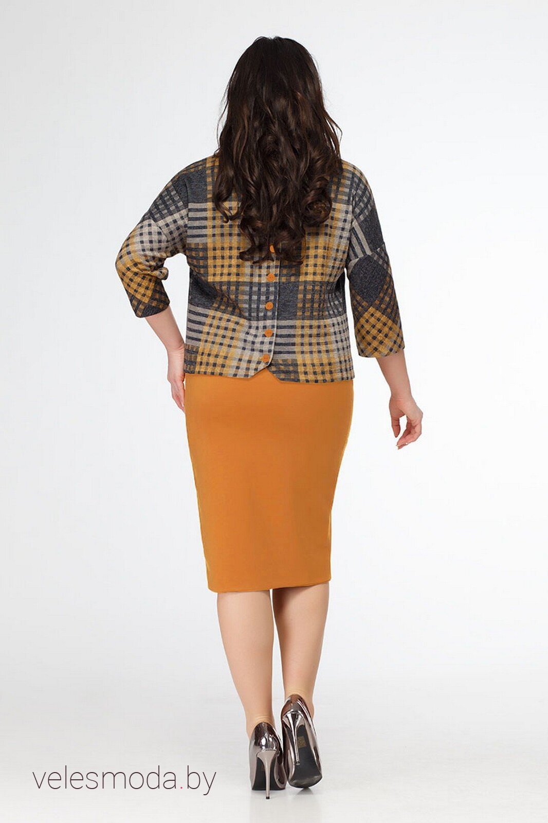Комплект из юбки и джемпера. Юбка из мягкого теплого трикотажа, хорошо тянется, пояс на резинке. Джемпер из мягкого трикотажа, хорошо тянется, рукав втачной на спущенной пройме, брошь съемная, застежка сзади на петли и пуговицы. Длина джемпера около 57 см. Длина рукава 3/4. Длина юбки около 67 см.