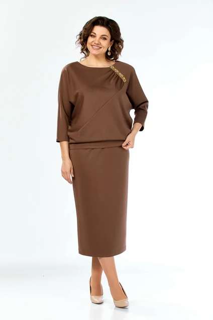 Костюм с юбкой 10020 AZZARA от бренда AZZARA предлагает стильное решение для модных женщин. Коллекция бренда сочетает удобство и элегантность в одном комплекте. Выполненный из полиэстера и спандекса, костюм обеспечивает комфорт и отличную посадку. Джемпер с покроем 'летучая мышь' и рукавом 3/4 украшен асимметричными подрезами и драпировкой, а также блестящей вставкой из тесьмы с пайетками и камнями, придающей оригинальности образу. Прямая юбка с эластичной тесьмой на поясе обеспечивает удобную посадку. Коричневый цвет костюма подчёркивает его универсальность, делая его подходящим для повседневного или офисного стиля. Это идеальный выбор для демисезонного гардероба.
