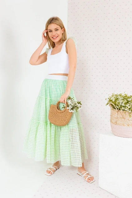 Юбка длиной макси, на подкладке, состоит из трех отрезных воланов. Пояс юбки - широкая резинка.