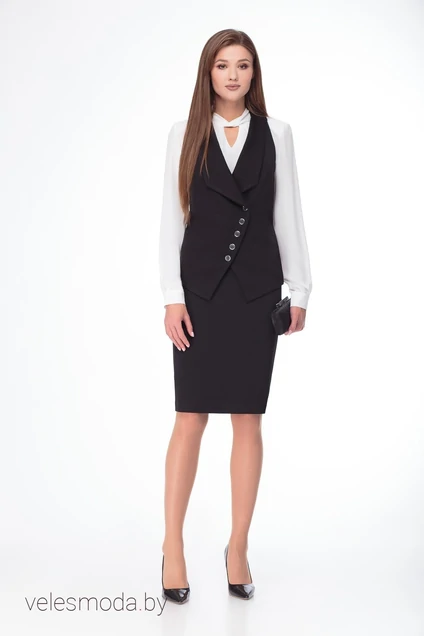 Жилет женский полуприлегающего силуэта, с круглым вырезом горловины, отложными лацканами и скошенной бортовой застёжкой на петли и пуговицы, с нагрудными вытачками и отрезным бочком. Спинка с талиевыми вытачками. Жилет длиной до линии бёдер.