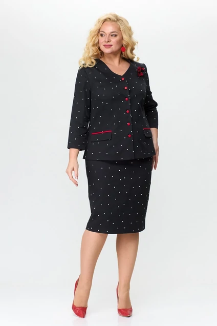 Элегантный женский костюм выполнен из хлопчатобумажной ткани с принтом «горох». Жакет полуприлегающего силуэта, с центральной застежкой на петли пуговицы, пуговицы в цвет отделки. Горловина «V» образная, по переду прорезные карманы с рамкой и клапаном, рамка контрастного цвета. Рукава втачные 3/4, по низу рукава притачной манжет. Спинка с центральным швом и рельефами. Жакет по переду подкладке. Юбка, зауженная к низу, застежка в центральном шве спинки на молнию. Верхний срез оформлен поясом с резинкой по боковым швам. По низу юбки на спинке - шлица. Юбка на подкладке. В комплект входит съемная брошь. Длина жакета по спинке - 62 см. Длина рукава - 50 см. Длина юбки - 68 см
