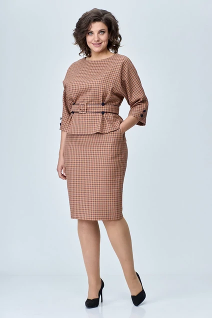 Элегантный женский костюм состоит из блузона и юбки.Костюм выполнен из комфортной костюмно-плательной ткани, с принтом в клетку.Блузон полуприлегающего силуэта с цельновыкроенным рукавом, по переду на уровне талии заложены складки, горловина круглая. Спинка с центральным швом. В комплект входит пояс с пряжкой.Юбка заужена к низу, по переду боковые карманы с подкройным бочком. Спинка с центральным швом и застежкой на тесьму «молния», по низу юбки разрез. Верх на поясе с резинкой. Длина блузона по спинке – 53/55 см. Длина рукава от горловины – 53 см. Длина юбки – 62/64 см.