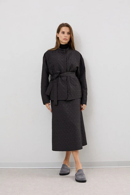 Комплект женский утепленный ,состоящий из жакета и юбки полуприлегающего силуэта , выполненный из фактурной ткани . Жакет с центральной застежкой на пришивных кнопках . Рукав спущенный одношовный. Воротник в виде невысокой стойки . По переду жакета подкладка ,а также функциональные карманы. В комплекте также пояс из основной ткани . Юбка трапецивидной формы на подкладке ,застежка по среднему шву сзади на молнию . Верх юбки обработан покройным поясом .